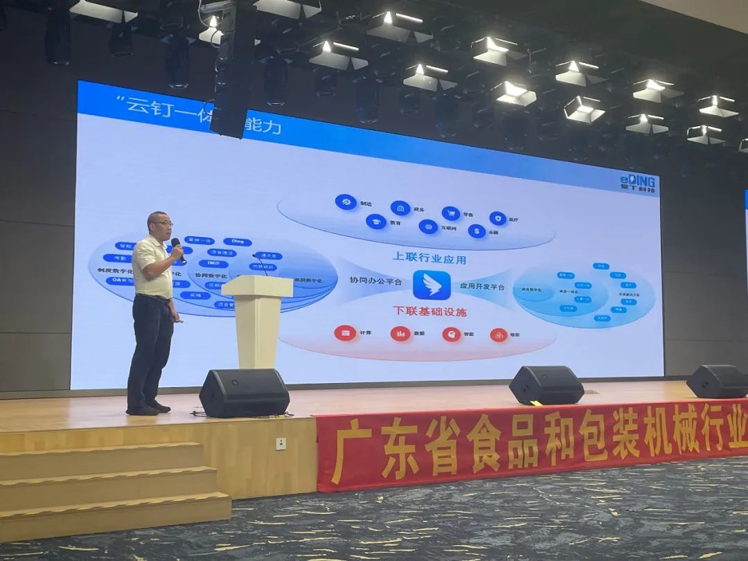在此次活动中,广州爱丁科技有限公司成功加入广东省食品和包装机械行业协会,成为会员单位,并在会上进行了演讲,分享了钉钉一体化解决方案如何助力食品和包装机械行业的数字化降低门槛。
