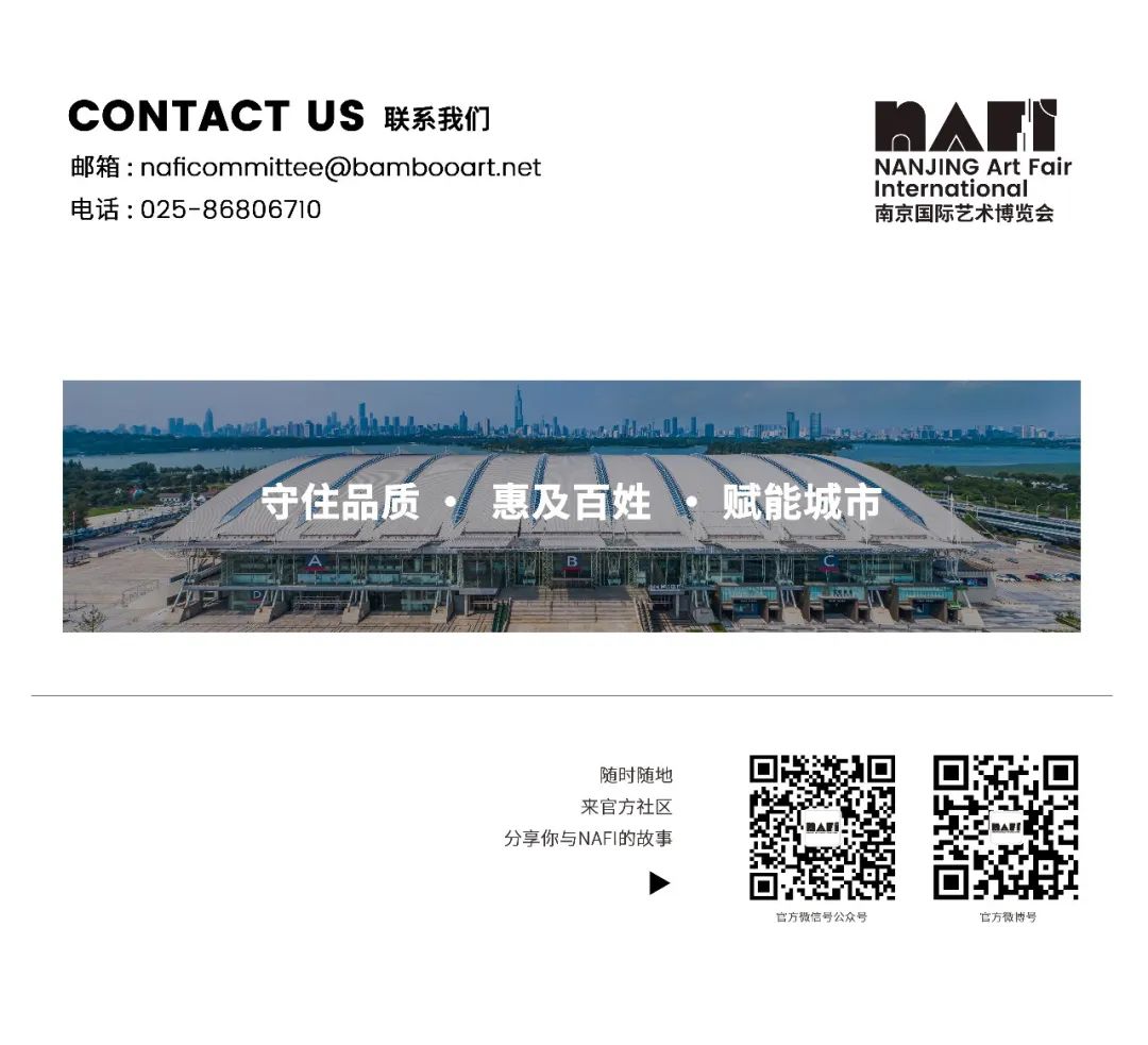 本届NAFI将秉承“守住品质·惠及百姓·赋能城市”的宗旨,保持历届展会的专业性、国际化及高水准。NAFI2023将汇聚三十五家左右国内外优秀画廊和当代艺术机构参展,并对板块内容进一步优化提升。保持常设展区5大主题板块严肃、专业、国际视野的同时,将增设【UNI-NAFI】主题展区,逐步构建兼容生活化、大众化及趣味性的艺术生活方式。在持续迭代中深耕南京本土艺术生态,打造城市级艺术飨宴。