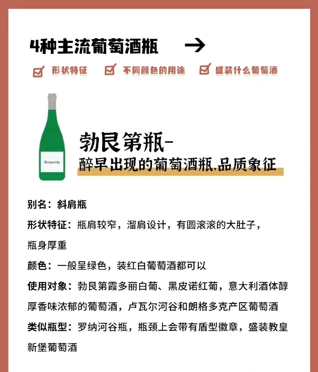 勃艮第瓶型(Burgundy)的肩部呈倾斜的流线型,略带流线的直身瓶型,瓶身较粗且瓶颈较长。用这种瓶子所装的葡萄酒?一般产自勃艮第产区。最常用于霞多丽和黑皮诺。肩窄瓶圆,瓶体厚重结实,线条柔和流畅,十分优雅。从瓶颈到瓶身下滑逐渐膨胀,胖胖的肚子和溜溜肩是它的标志。