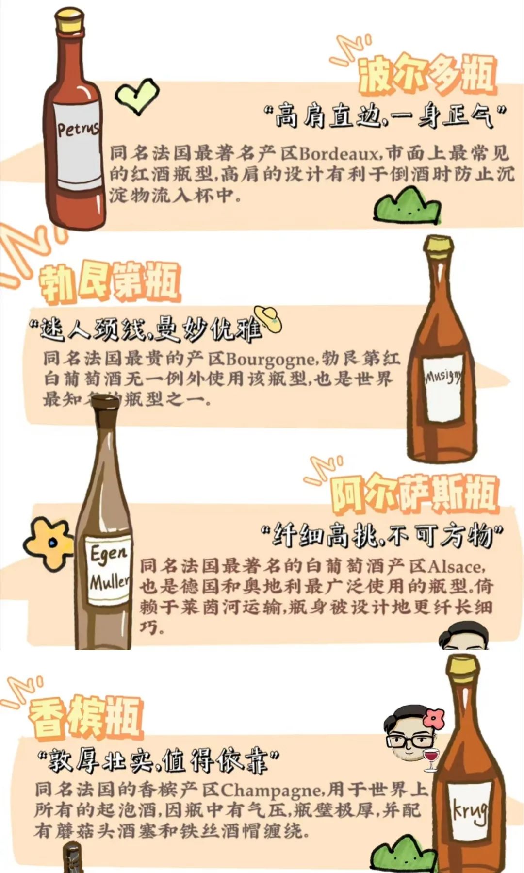 波尔多瓶是最常见的瓶型,亦称高肩瓶、克莱雷瓶(Claret)。圆柱形的瓶身搭配高宽的“肩膀”,两侧呈流线型,笔直的身躯,有棱有角的样子像穿了一件笔挺的西装,所以我们姑且称其为“装正经”。这种设计便于出口和陈年,防止在运输途中过于颠簸,在倒酒时能卡住沉淀物。