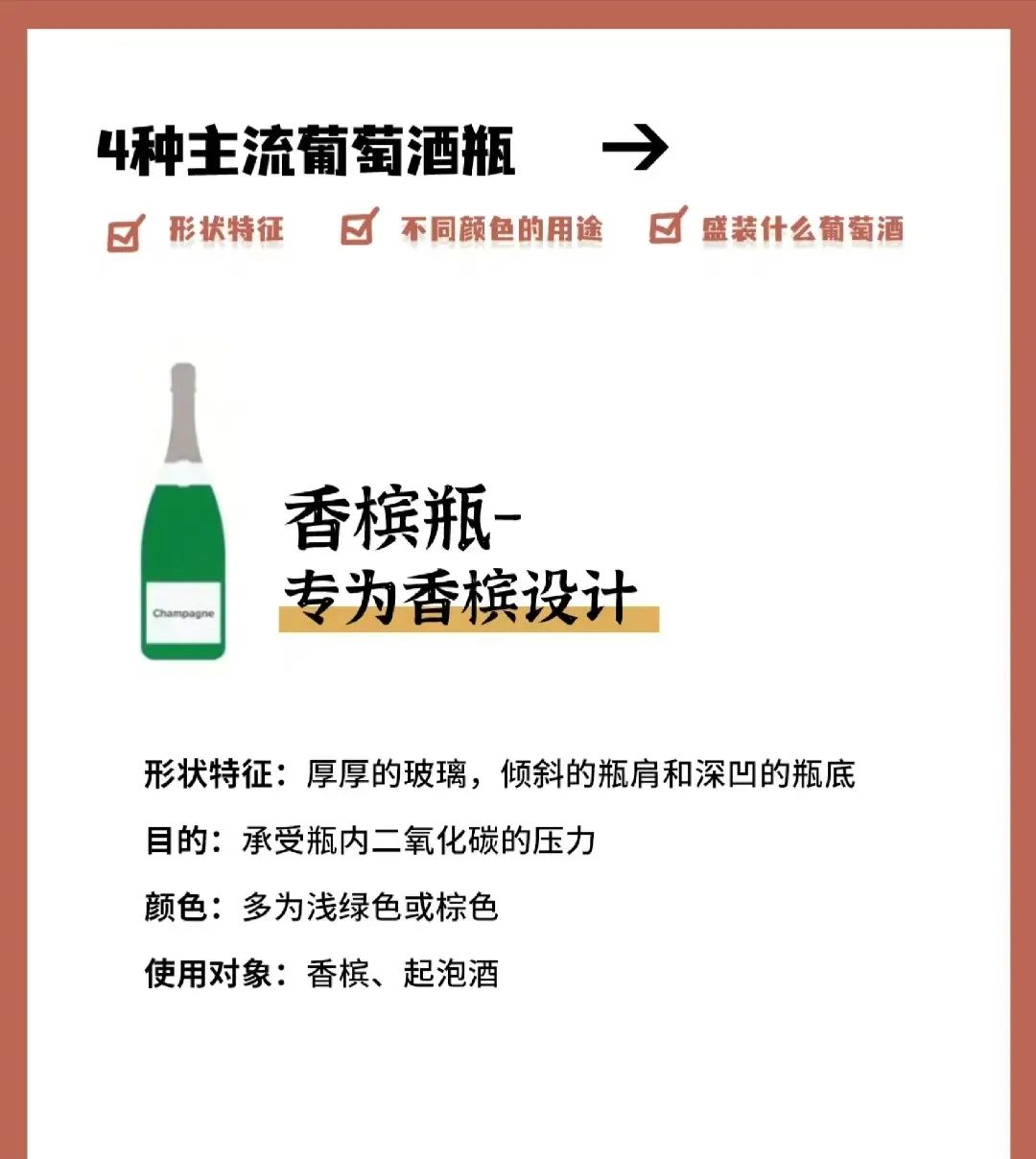 香槟瓶?(Champagne)瓶子更重、更厚,瓶口与蘑菇头的瓶塞形成闭合的结构。从名字可以看出,用这种瓶子所装的香槟?都来自香槟产区。根据当地法律和欧盟条例规定,全世界范围内,只有法国香槟产区出产的气泡酒才有资格被称为真正的香槟,其他地区出产的同类型酒只能称为起泡葡萄酒。