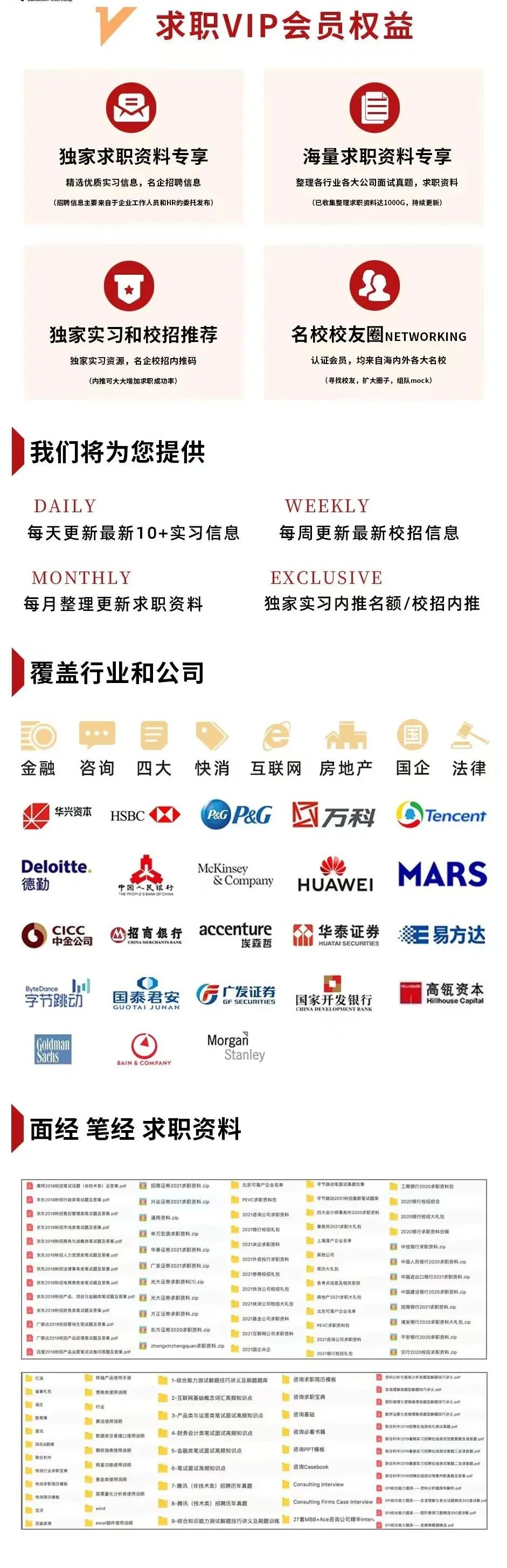 行业:外资投行、券商、事务所、公募基金、银行、互联网、快消、咨询、地产公司、国企央企等等 公司:摩根士丹利、瑞银集团、汇丰银行、德意志银行、易方达基金、汇添富基金、博时基金、华夏基金、央行、国开行、进出口银行、农业发展银行、五大行、建设银行、浦发银行、招商证券、申万宏源、广发证券、方正证券、国泰君安、光大证券、MBB、国家电网、中国石油、腾讯、字节跳动、阿里巴巴、华为、四大、立信、碧桂园、保利地产、恒大、万达、戴德梁行等等 其他:简历大礼包、北京/上海落户名单、各行业薪资表......
