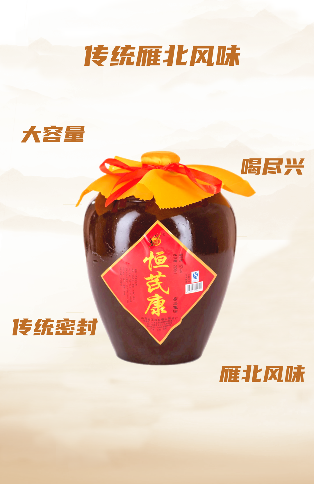 高粱王酒,传统特色猪血草纸密封方式,且坛装更具有各种保存酒质的优点。52度雁北老风味,5斤大容量让您喝的尽兴,一桌一开坛仪式感满满,入口纯正,酒尾厚重,复古包装,是增进感情、提升氛围的不二之选。