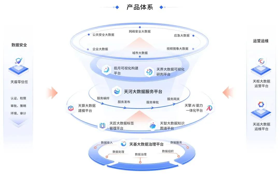 乾坤大数据操作系统具备“核心基座”和“通用支撑工具”两种产品形态,各行业可根据不同领域要求,基于QKOS不同的产品形态封装形成不同的领域产品。在通用支撑工具方面,美亚柏科现已推出十个大数据全生命周期的实战工具,即九天揽月,包括天基大数据治理平台和天河大数据服务平台两大核心产品,以及“天算”、“揽月”、“天巡”、“天匠”、“天智”、“天擎”、“天枢”等能力产品和天盾零信任安全防护产品,助力行业实战场景的快速落地。