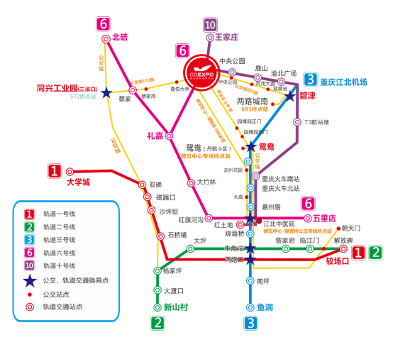 2、重庆北(龙头寺)火车站:乘坐轨道三号线抵达红旗河沟,换乘轨道六号线抵达国博中心站;或坐轨道三号线抵达鸳鸯站,换乘国博中心专线车抵达——重庆国际博览中心南区展馆;乘坐轨道十号线抵达悦来站。