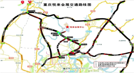 2、高速公路G50(沪渝高速)、G65(包茂高速)、G75(兰海高速)、G85(渝昆高速)、G93(成渝环线)等各条高速路—内环快速路—东环立交—机场高速—宝圣立交—宝圣隧道—金兴大道—白鹤咀隧道—翠云立交—园博园正门—赵家溪立交—金兴大道—张家溪大桥—会展大桥—会展立交—会展大道—重庆国际博览中心。