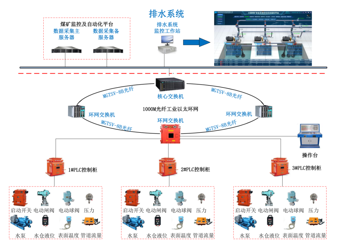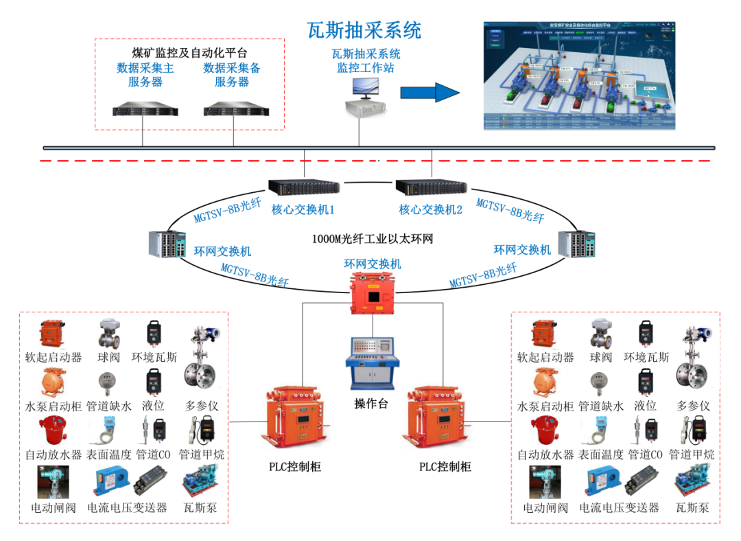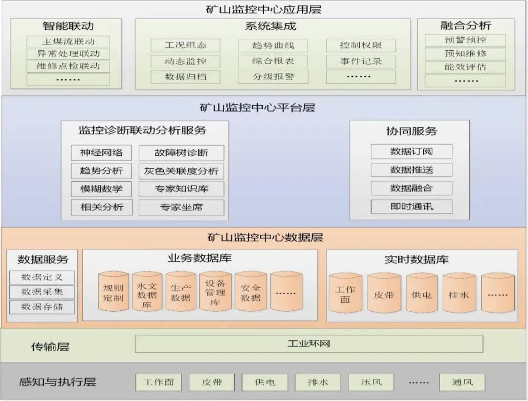 平台是以工业以太环网为核心,整合矿井的各项自动控制系统,通过防火墙与矿级管理系统组成高速统一的整体网络结构,实现了全矿井的管控一体化。