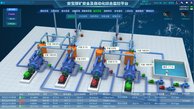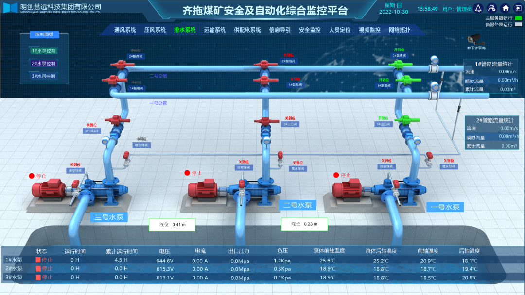 •系统实时监测泵房视频、设备温度(水泵轴承温度、电机绕组及轴承温度)、流量、水仓水位、压力(含管路压力、真空泵负压等)、真空度、排水量等参数;远程/就地控制排水泵的起停,管道阀门的开闭状态等。