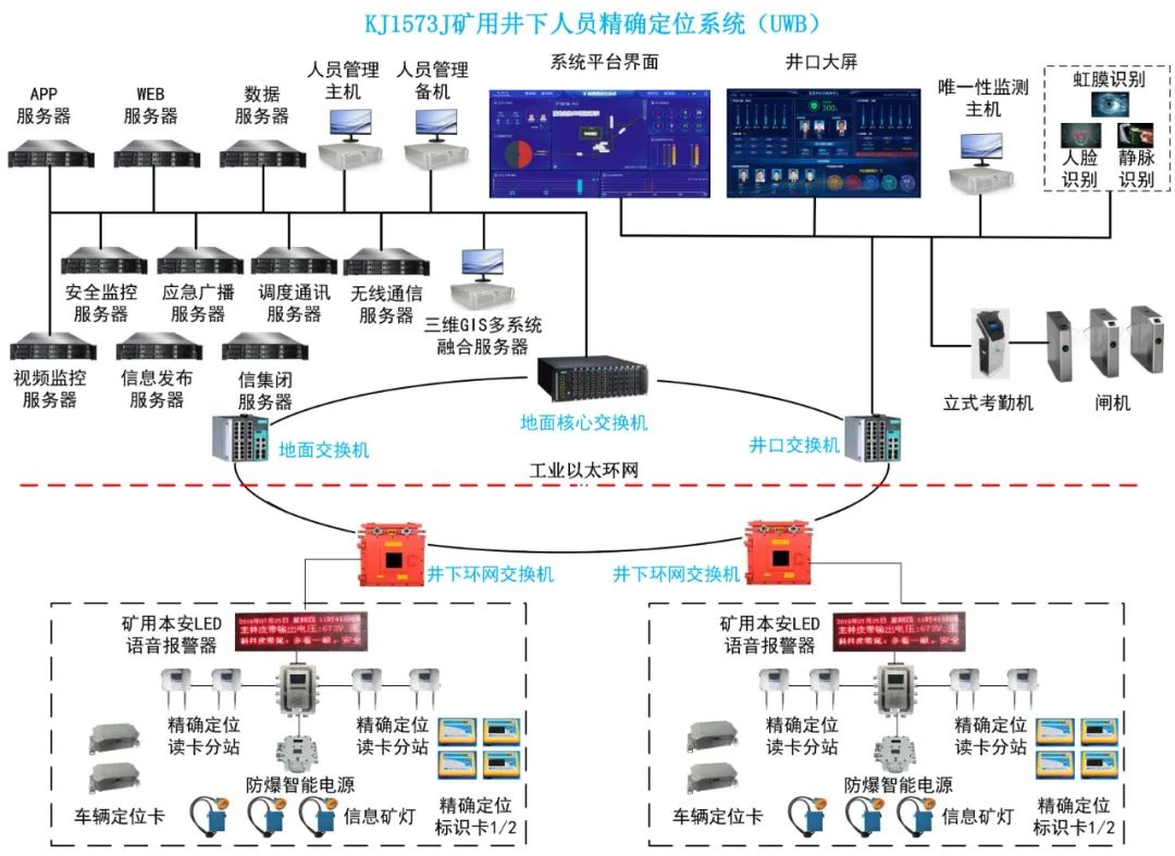KJ1573J矿用精确定位系统是全新设计的新一代精确定位系统,加强入井人员管理、提升生命保障、为促进矿井的安全生产提供技术支持和装备保障。系统采用UWB无载波通信技术、网络通讯技术、Ecom高速通讯技术、WEB-GIS与计算机编程技术以及无线定位技术等,支持物料配送管理、车辆和人员精确定位、井下信号灯管理、车辆调度管理、信息化管理,实现对入井人员的实时监测、命令呼叫、轨迹回放、考勤报表、历史查询、应急搜救、报警显示和查询、双机热备等功能,采用三维GIS地图将矿山及工厂以三维立体界面显示,为矿山安全生产和应急救援提供可靠的决策支持信息。该系统提供标准的resetful api,便于接入多种“智慧”管控平台;便于基于此系统做二次开发。