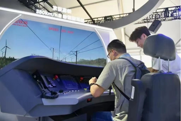 吸引观众打卡的,还有中国铁道科学研究院展出的1:1还原高铁自动驾驶模拟控制台。观众落座,通过推动列车牵引、制动手柄,就能自主操控列车速度,配合眼前的大屏幕,以驾驶员视角逼真体验在京张高铁“加速度”的乐趣。