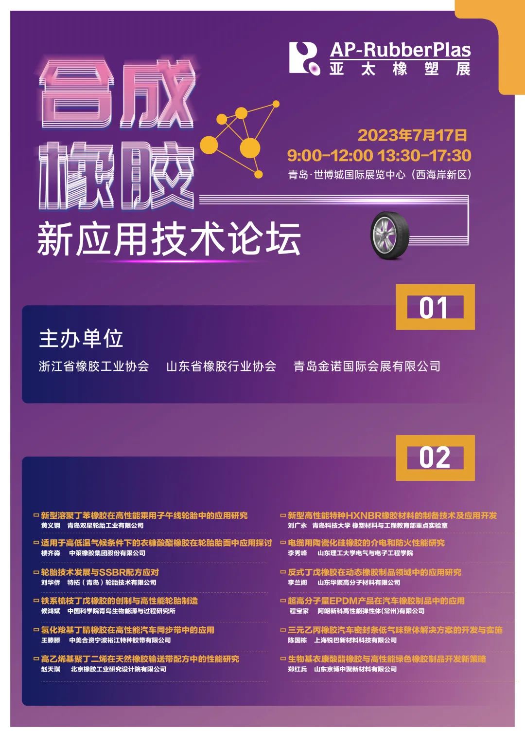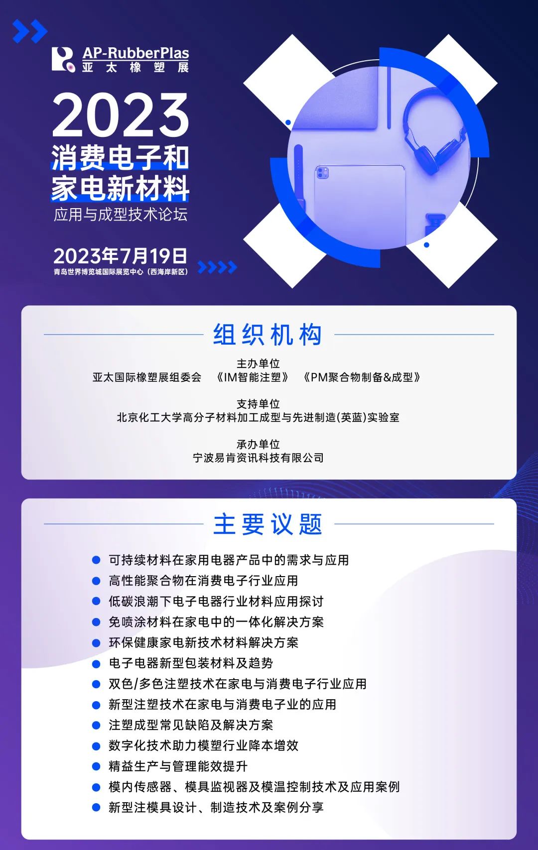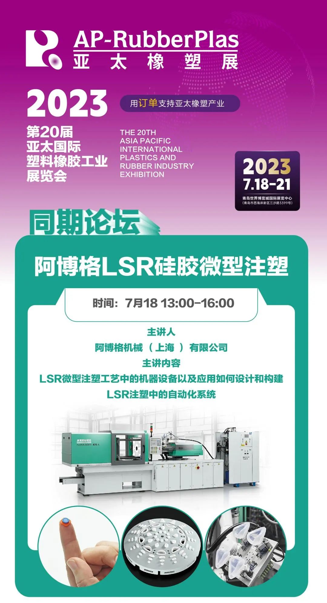 2023第20届亚太国际塑料橡胶工业展览会将于2023年7月18日——21日于青岛世博城国际会议展览中心举行,同期举办2023年橡胶行业论坛—2023消费电子&家电新材料应用与成型技术论坛、阿博格LSR硅胶微型注塑、合成橡胶新应用技术论坛等同期活动,金诺美酒嘉年华也将同期举行!