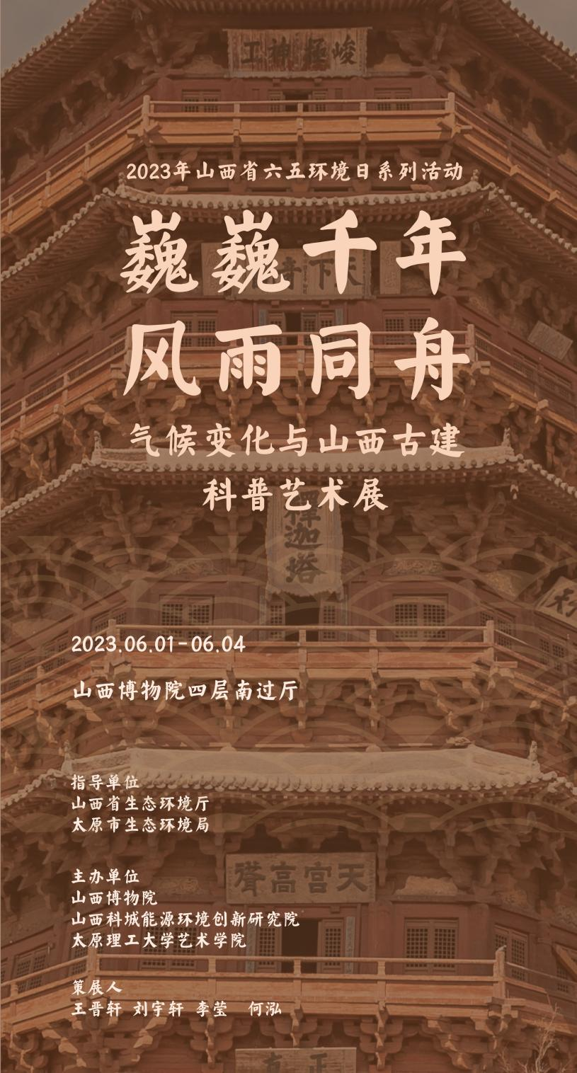 为呼吁公众关注气候变化对古建筑带来的严峻威胁,在山西省生态环境厅和太原市生态环境局的指导下,山西科城能源环境创新研究院将联合山西博物院、太原理工大学艺术学院于2023年6月1日至4日期间,于山西博物院四层南过厅开展“巍巍千年 风雨同舟——气候变化与山西古建”科普艺术展。