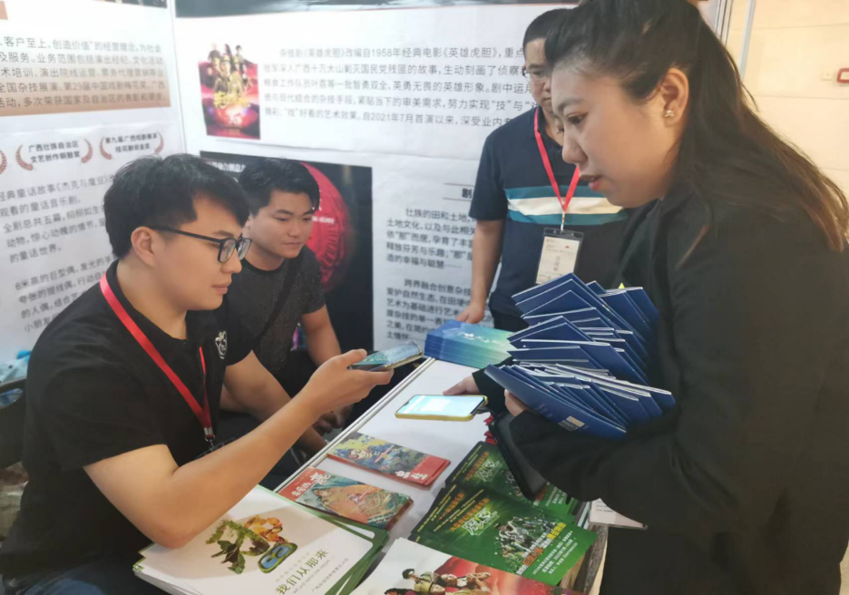 本次交易会演出公司及各院团带来了多部原创精品剧目在现场进行推介。在演出公司展位上,来自全国各地的剧目采购商纷纷驻足停留,洽谈合作,工作人员积极对剧目进行介绍,现场气氛热烈融洽。通过本次展会,广西演出公司成功促成童话音乐剧《魔豆》共计20余场巡演合作意向,预计下半年将分别在柳州、贵阳、昆明、成都、重庆、广州、深圳、长沙、武汉、合肥、石家庄等城市进行演出。同时,演出公司还与多家机构洽谈精品剧目引进事宜。