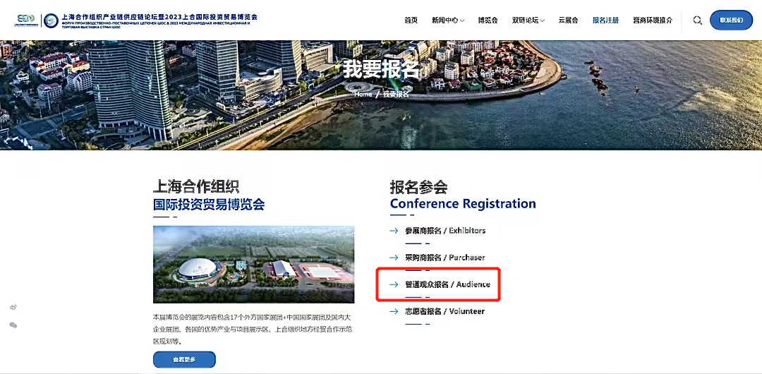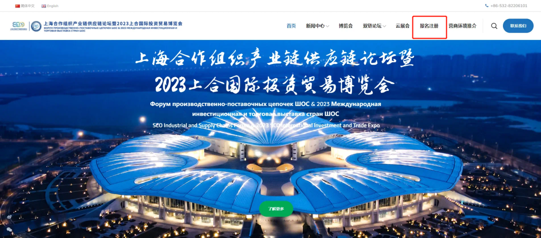 ①登录“上海合作组织产业链供应链论坛暨2023上海合作组织国际投资贸易博览会”官方网站(https://www.sco-qd.com/),或点击文末“阅读原文”跳转网站。