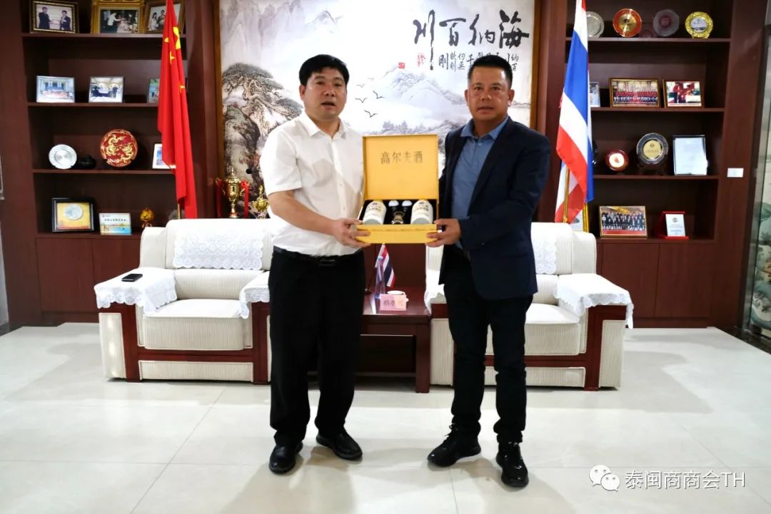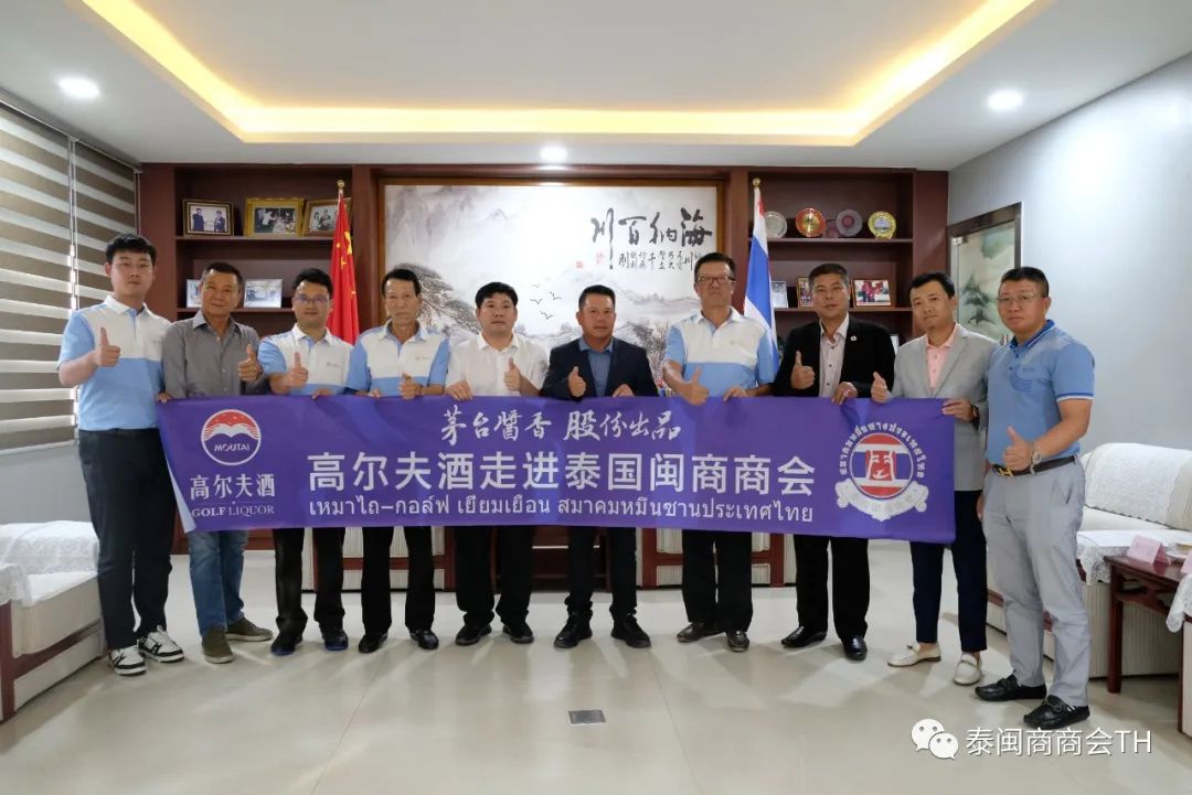 5月24日,仁怀高尔夫酒销售有限公司邹帮清总经理一行莅临泰国闽商商会,会长蔡孝兴、副会长兼秘书长黄宏霖、副会长谢海盛、徐振响、鹿高明、陈德桐出席接待,双方进行友好会谈。蔡孝兴会长代表商会对邹帮清总经理的到来表示热烈欢迎,他说泰国是个微笑的国度,人民热情友善,更是一个高尔夫球的天堂,不仅具有众多世界级高水平的球场,更是以优质的服务享誉世界,泰国闽商商会也成立了一支高尔夫球队并定期举办月例赛,以球会友,宣传健康的生活方式。茅台高尔夫酒将茅台酒与高尔夫运动结合,为两者之间的跨界合作注入新的活力,积极弘扬中华酒文化,希望双方能够进一步深化合作,推动中泰两国的商业交流与文化互鉴。邹帮清总经理对蔡孝兴会长的热情接待表示感谢,他表示,享誉全球的百年品牌贵州茅台酱香酒,在传承优秀传统酿酒技艺的同时,不断创新发展,顺应时代发展,十年磨一剑,推出深受广大高尔酒喜爱的高端酱香型白酒,并且积极推广国际市场,以酒为媒,积极推广中华文化,促进两国人民的文化交流。希望今后能与泰国闽商商会合作,进一步促进高尔夫运动和酒文化之间的交流与融合。仁怀茅台高尔夫酒销售有限公司的访问团成员有:邹帮清总经理、周聃国际贸易经理、(纳拿攀贸易有限公司董事长)王京会高尔夫酒泰国代理、蒋振禹东南亚区域经理。