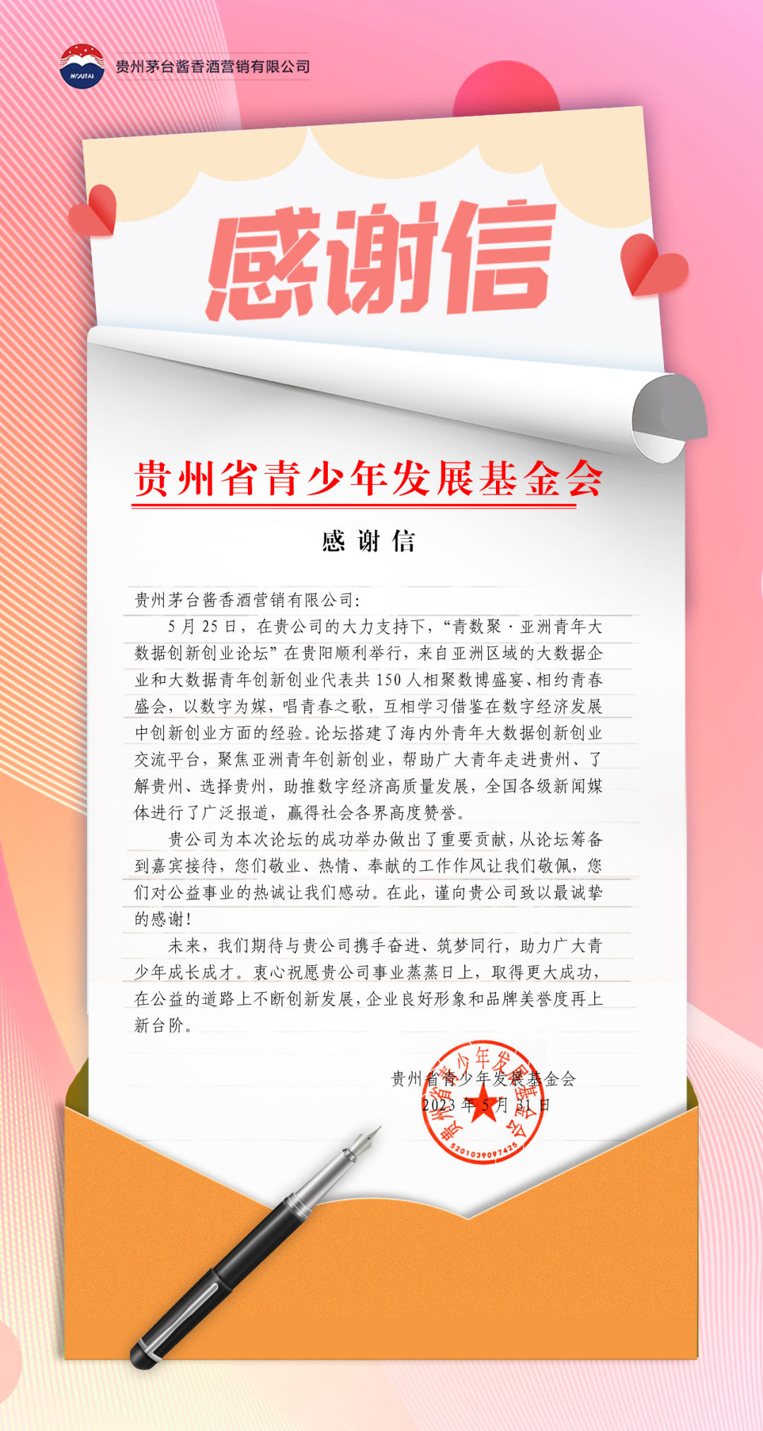 5月25日,酱香酒公司收到来自贵州省青少年发展基金会的一封感谢信,信中表示,在酱香酒公司的大力支持下,“青数聚·亚洲青年大数据创新创业论坛”在贵阳顺利举行。酱香酒公司为本次论坛的成功举办做出了重要贡献,贵州省青少年发展基金会向酱香酒公司致以最诚挚的感谢!