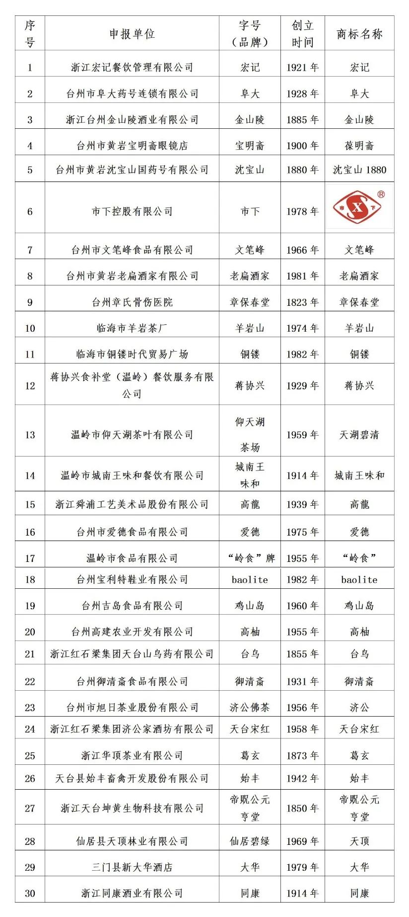 首批“台州老字号”名单(30家)