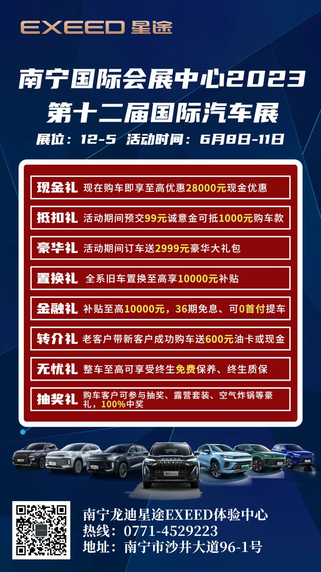 在2023年6月8日-6月11日的本届北部湾车展上,星途来了5台重磅级惠民好车,随之而来的便是本次车展的优惠政策,希望看完后,您能到我们的12号馆12-5展位看我们的星途汽车。