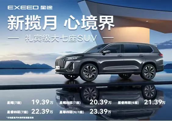 新揽月,心境界。4月9日,随着一场以《揽月和他的朋友们》为主题的两周年粉丝派对举办,“礼宾级大七座SUV”全新一代揽月以30+项满阶升级的十足诚意,在众多星途忠实粉、揽月老车主和大定用户的欢呼声中C位闪耀上市。新车共推出星耀(7座)、星耀四驱(7座)、星睿两驱(6座)、星睿四驱(7座)、星尊四驱(6/7座)五款配置版型,官方指导价为19.39万元-23.39万元,维持原有价格区间,做到了“增配不加价、超值再升值”。得益于此次产品竞争力的大幅提升,全新一代揽月将以破竹之势成为大七座SUV豪华旗舰领军之选,树立全新价值标杆典范。