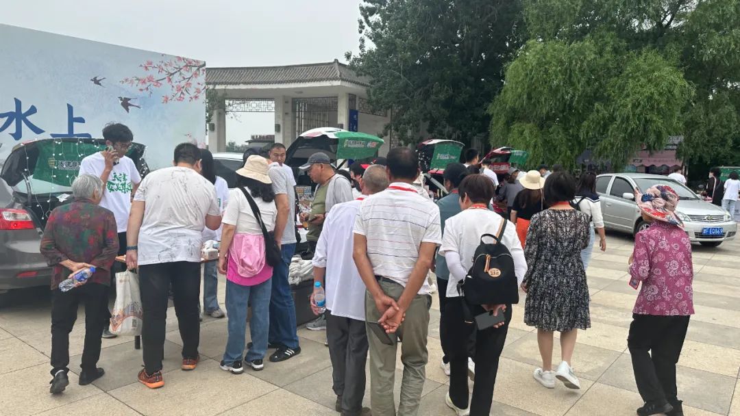 精心装饰过的后备箱焕然一新,灯串、彩旗、笑脸气球将氛围感直接拉满。一辆辆车在水上公园西门整齐排列,摆起琳琅满目的商品,吸引了众多顾客前来。