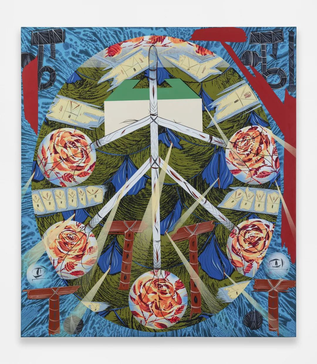 拉里·皮特曼(Lari Pitmann,1952-)生于加利福尼亚洛杉矶,现居住和工作于洛杉矶。拉里·皮特曼在他几十年的职业生涯中发展出独特的视觉美学,并成为同生代中最重要的画家之一。皮特曼以密集堆叠的绘画风格而著称,包括符号和象征(如钟、鸡蛋、动物和绳索)、多种绘画技巧的组合,以及对手工制作、工艺和装饰艺术的致敬。皮特曼创作复杂的构图,以卓越的灵巧性在色彩、文字和意象之间的张力、景观和装饰、混乱和秩序中寻找平衡,并通常以大画幅呈现。他用与生俱来的天赋使绘画中每个元素都获得平等的空间和重要性。
