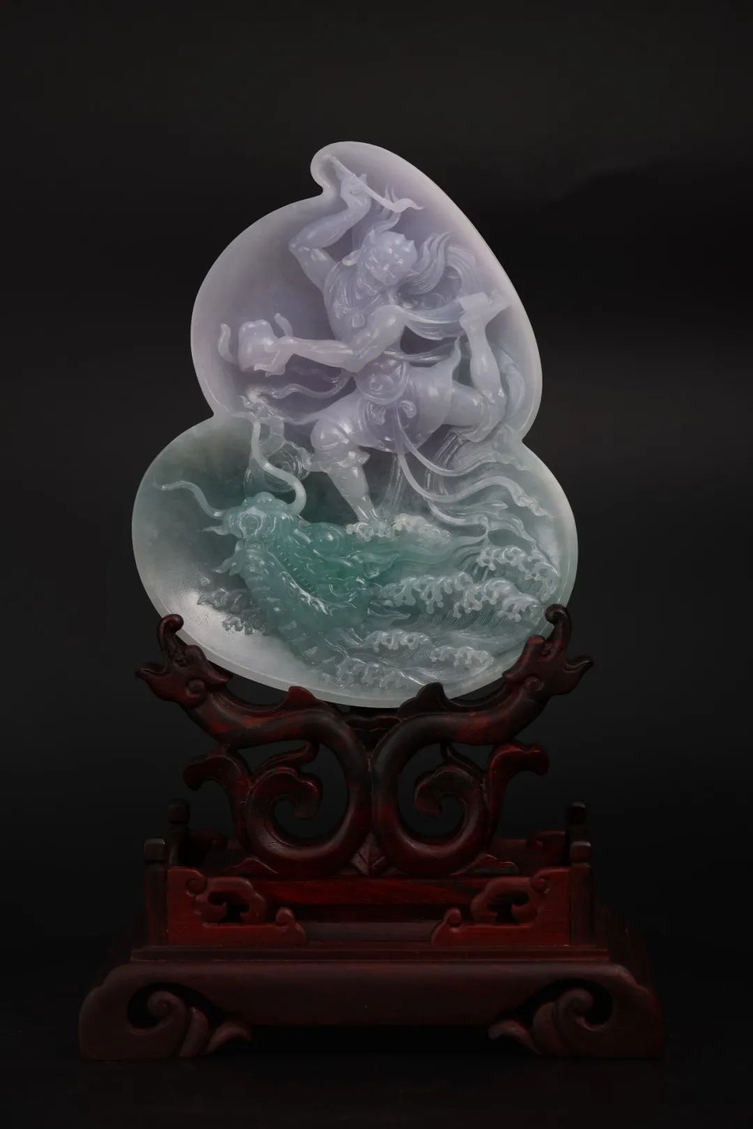 作品简介:本件作品乃是冰种,春带彩雕刻而成,外型呈葫芦状。绿色玉质雕刻从海浪中奔涌而出的鳌头,紫色玉质雕刻而成的魁星独站在鳌头之上,魁星一手拿着官帽,一手点着右脚托着的玉斗。魁星点斗独占鳌头,高考录取“翡”你莫属。