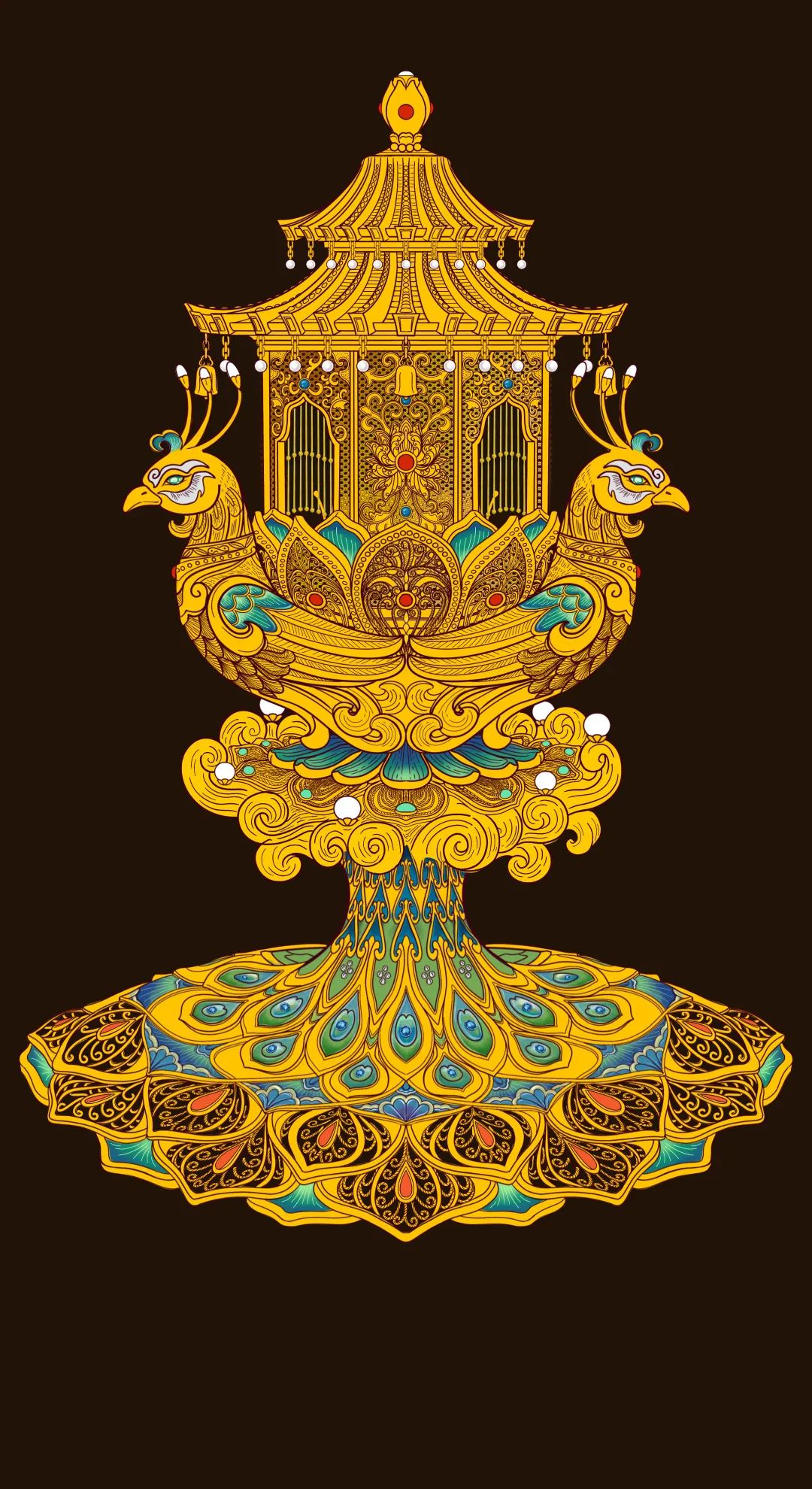 作品简介:方案以孔雀开屏的羽翎演化为柱,自下而上升腾出如云如海的平面,随后又渐渐幻化出孔雀圣象,犹如羽化升仙般绽放而出。展现出孔雀的圣洁、高贵与神圣。其双翅环扣,守护在圣莲左右。层层花瓣将亭身包裹,透过缕缕珠帘,隐约看到中心一颗莲心,好似静心禅坐的修行者一般,不受外界侵扰。上托的12只花瓣轻柔展开,象征着有圆满之意。