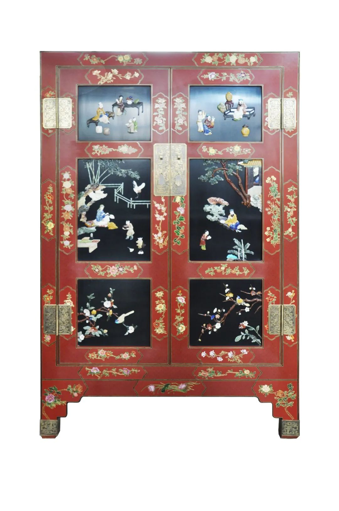 作品简介:作品造型经典,柜体采用雕填工艺雕刻成锦地和花卉图案,色彩柔美,锦地规整,线条流畅。精选寿山石、青田石、巴林石、姜黄石、螺钿、兽骨、岫玉等各种天然名贵材料,以搜、磨、堆、铲、嵌等技法,将人物、花鸟、楼台浮雕镶嵌于漆胎之上,质地晶莹温润,色泽自然纯正。柜体和柜门制作采用雕填工艺做锦地,开光做花卉,取其锦上添花之意。作品精美细腻,极具富丽堂皇的宫廷艺术风韵,给人以高雅、清新的艺术感受,极具收藏价值。