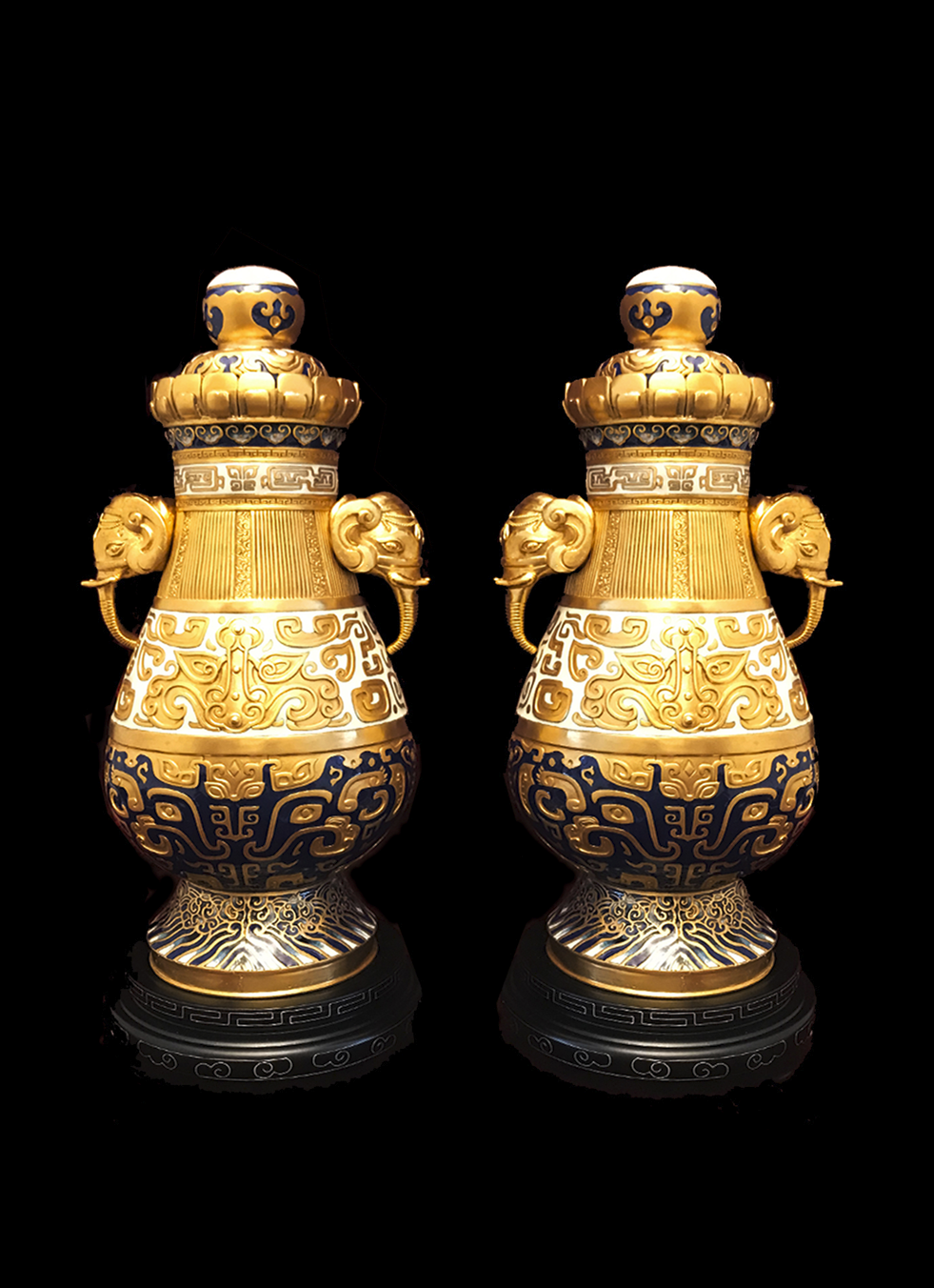 作品简介:作品耗时两年,以濒临绝迹的錾胎珐琅技艺(全部图案结构与配饰均为手工錾刻)精制而成。顶盖錾刻如意宝莲花,耳部如意象首,瓶身饰如意纹、宝相花、如意龙纹、如意象纹、吉祥龙凤纹和底部海水江崖构成,展现江山永固,万代吉祥等美好主题。作品整体古朴典雅、恢弘大气、庄重华美。以古老的錾胎珐琅工艺,融入创新设计的作品,将古今文化精髓提炼凝聚一身,成就新时期工艺精品。