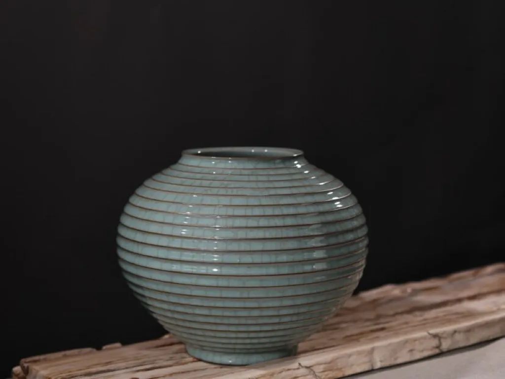 作品简介:此件作品以哥窑紫金土为胎,施粉青釉,外表面以弦纹出筋、露胎和铁线作装饰。胎的棕色、釉的蓝色以及铁线的黑色,3种色彩形成色差对比,让观者有传统古朴的质感,相互辉映,相得益彰。这件作品造型简洁大气,古朴端庄,气质典雅,立意新颖。以哥窑开片与弦纹结合,让纹片有层次而不杂乱,传统又不失新意,更加的耐看。
