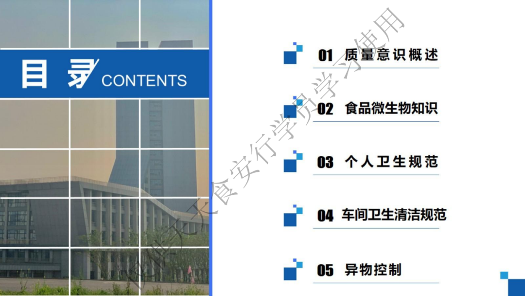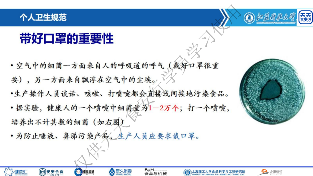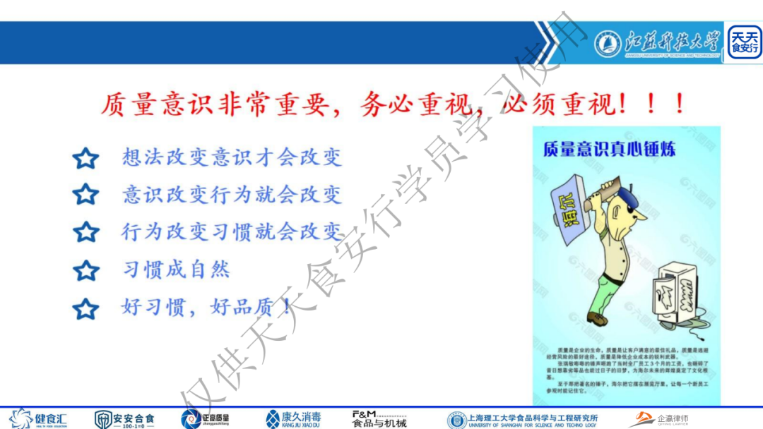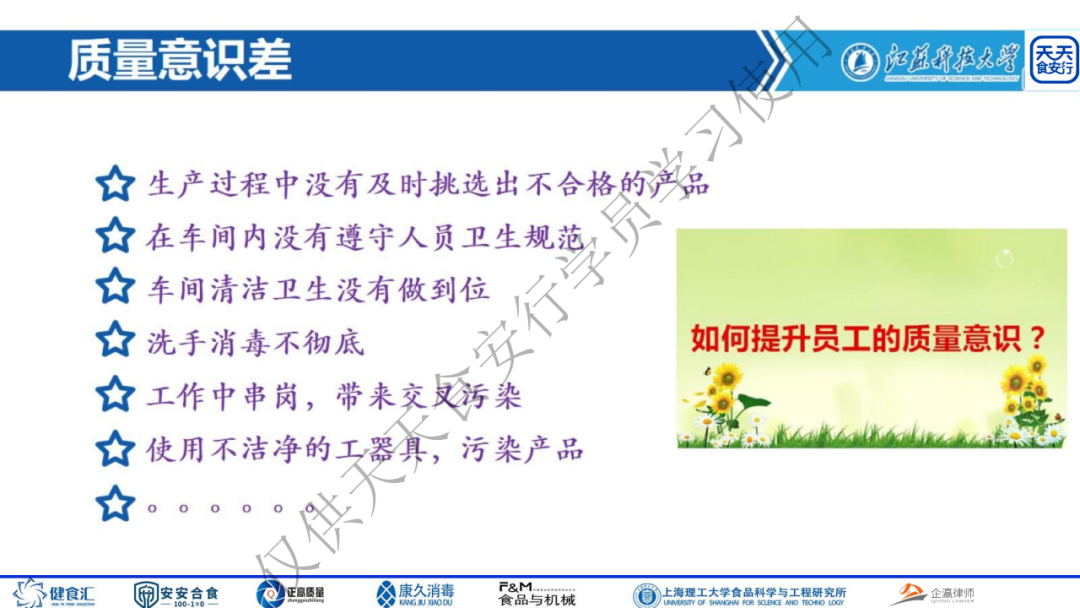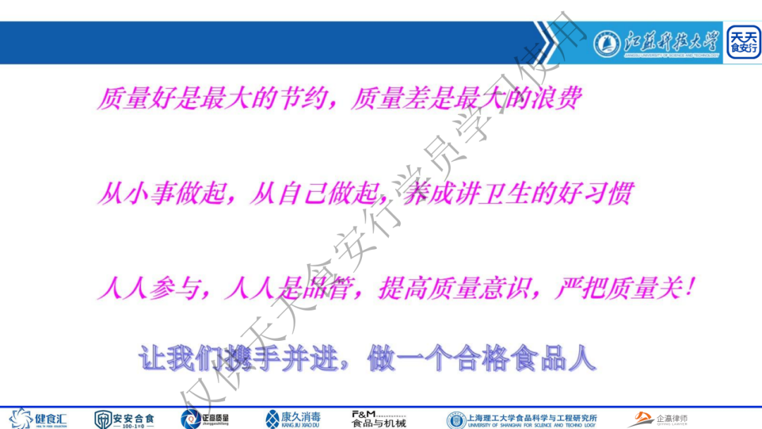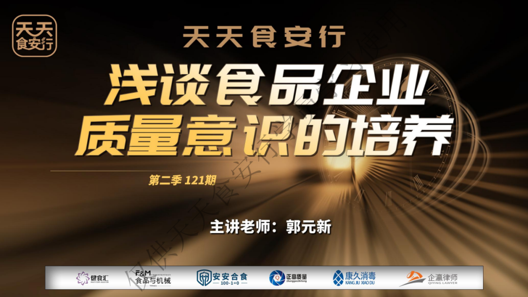 2023年05月30日下午14:00-15:00,天天食安行·公益大讲堂:江苏科技大学教授,食品质量与安全系主任,工学博士,硕士生导师,国家注册QMS及FSMS体系审核员,江苏省省级科技特派员郭元新教授给大家分享《浅谈食品企业质量意识的培养》