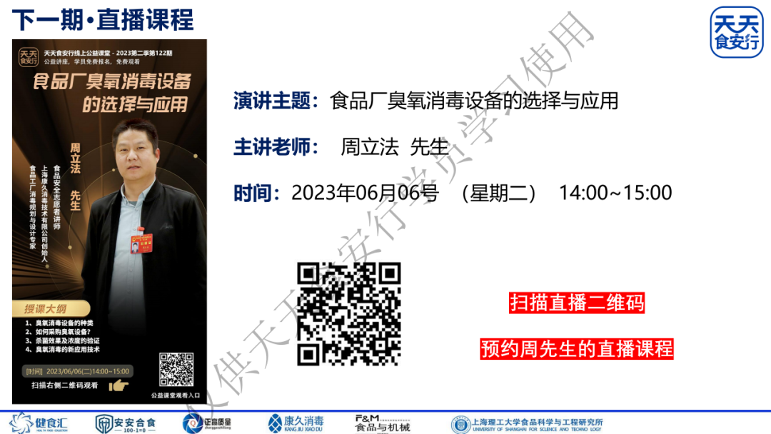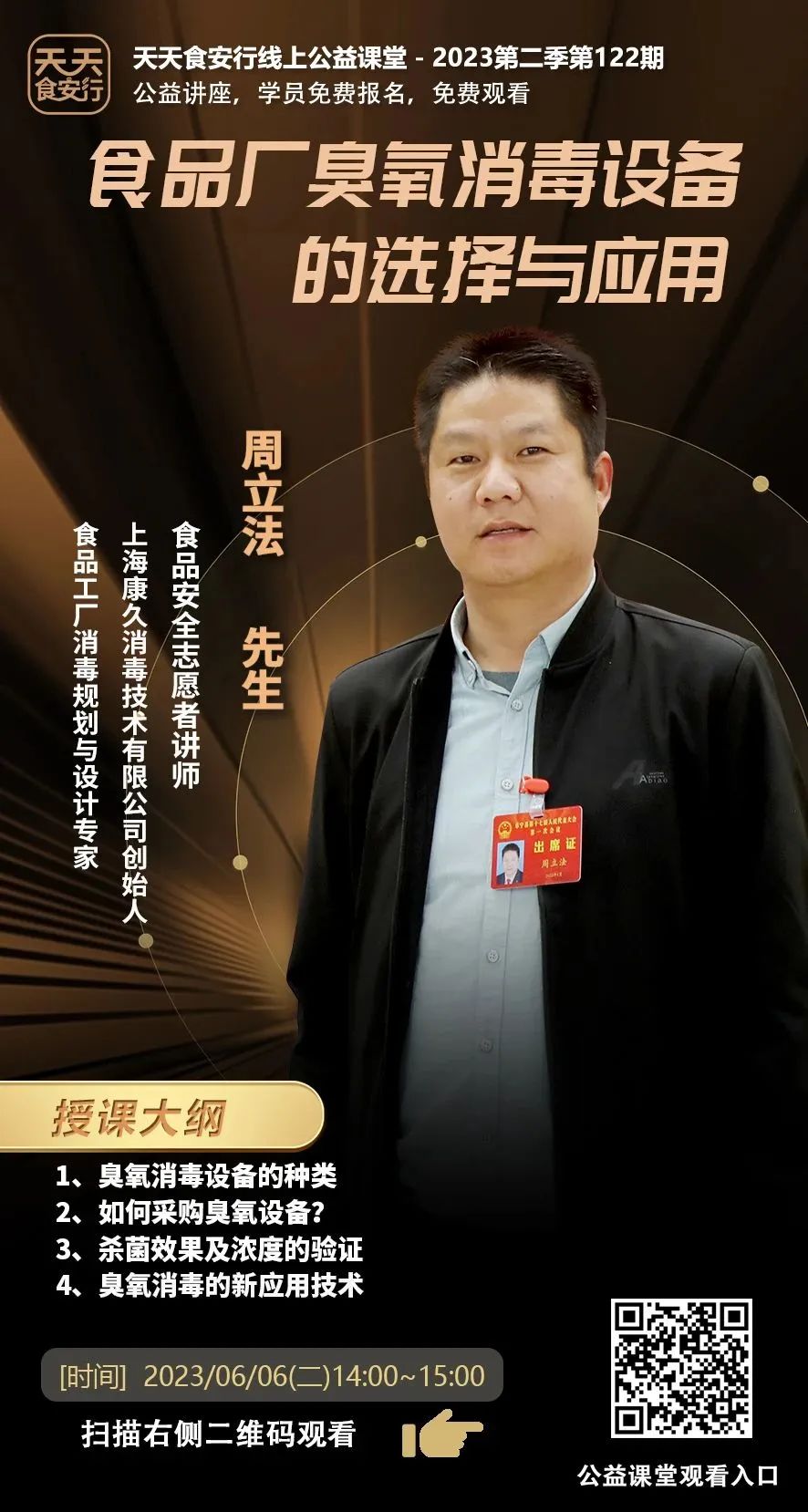 2023年06月06日下午14:00-15:00,天天食安行·公益大讲堂:上海康久消毒技术有限公司创始人、食品工厂消毒规划与设计专家周立法先生,给大家直播分享《食品厂臭氧消毒设备的选择与应用》。点击下图长按“识别图中的二维码”,提前登记、预约直播课程。公益讲座,不收取任何费用。