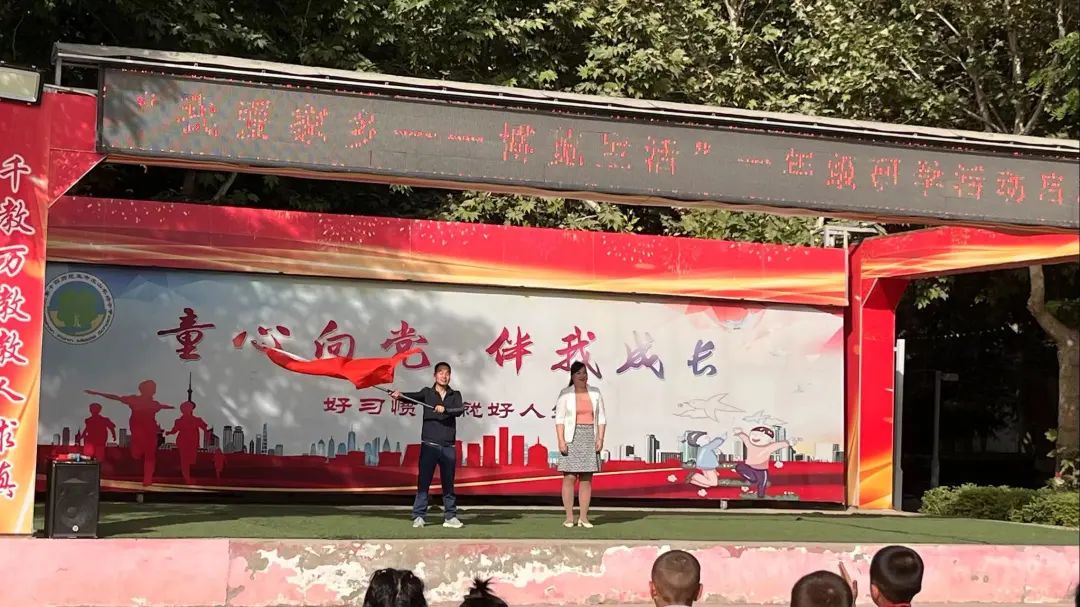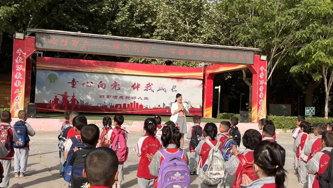 在学生响亮的口号中,李娟娟校长为一年级组授旗,相约五月的研学旅行正式拉开序幕。