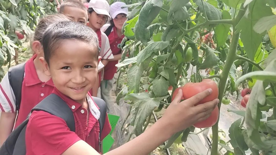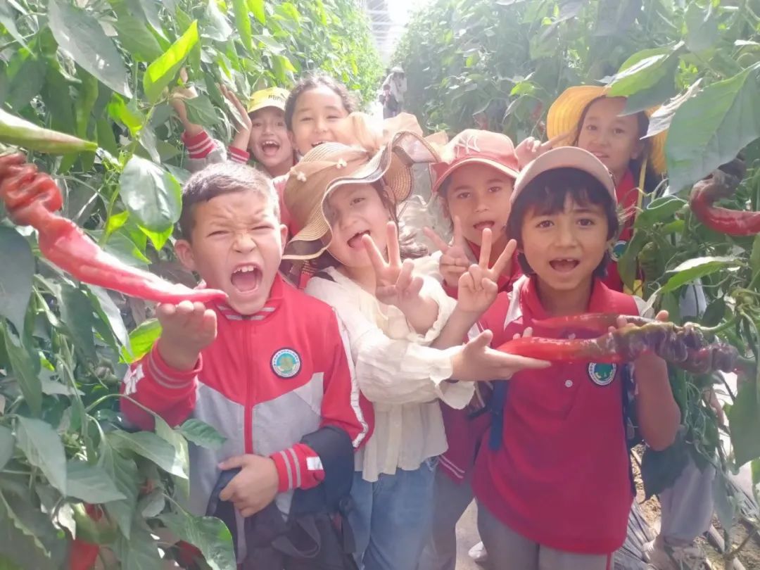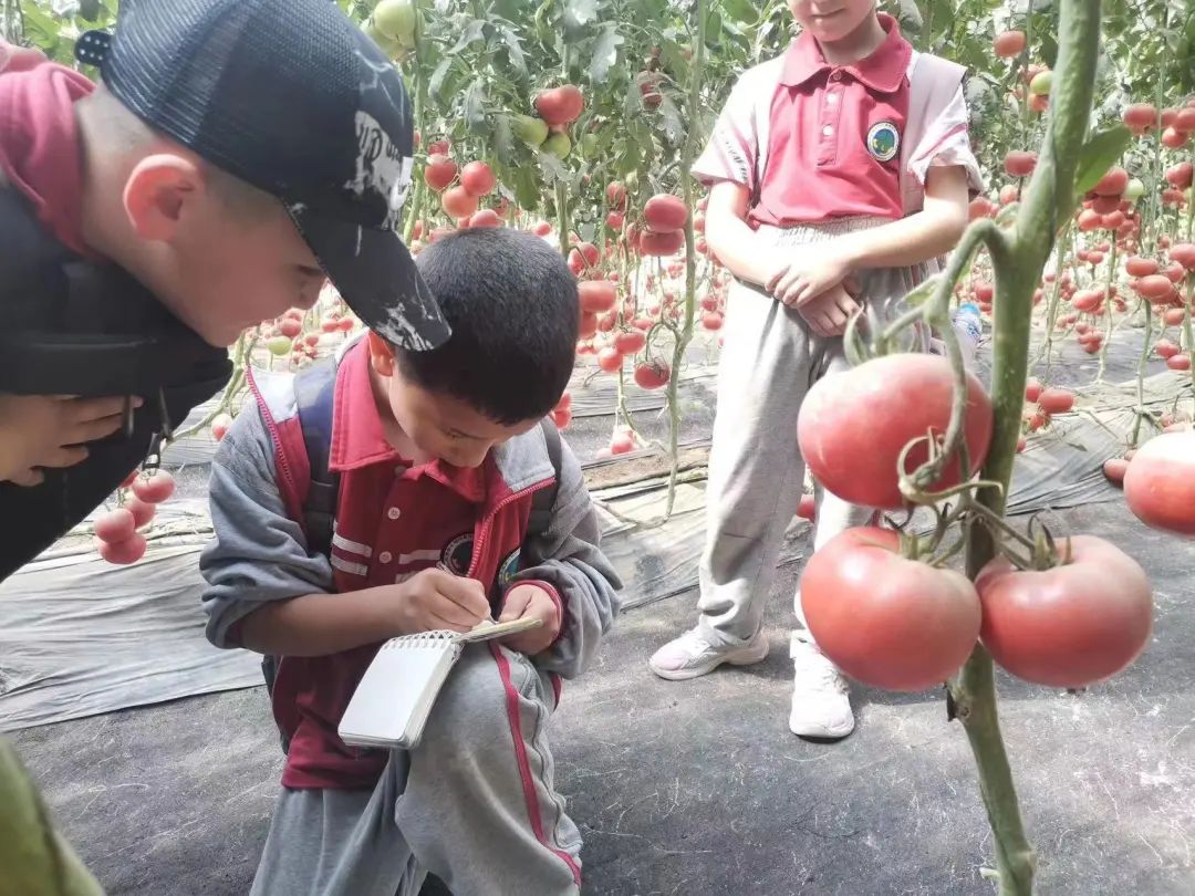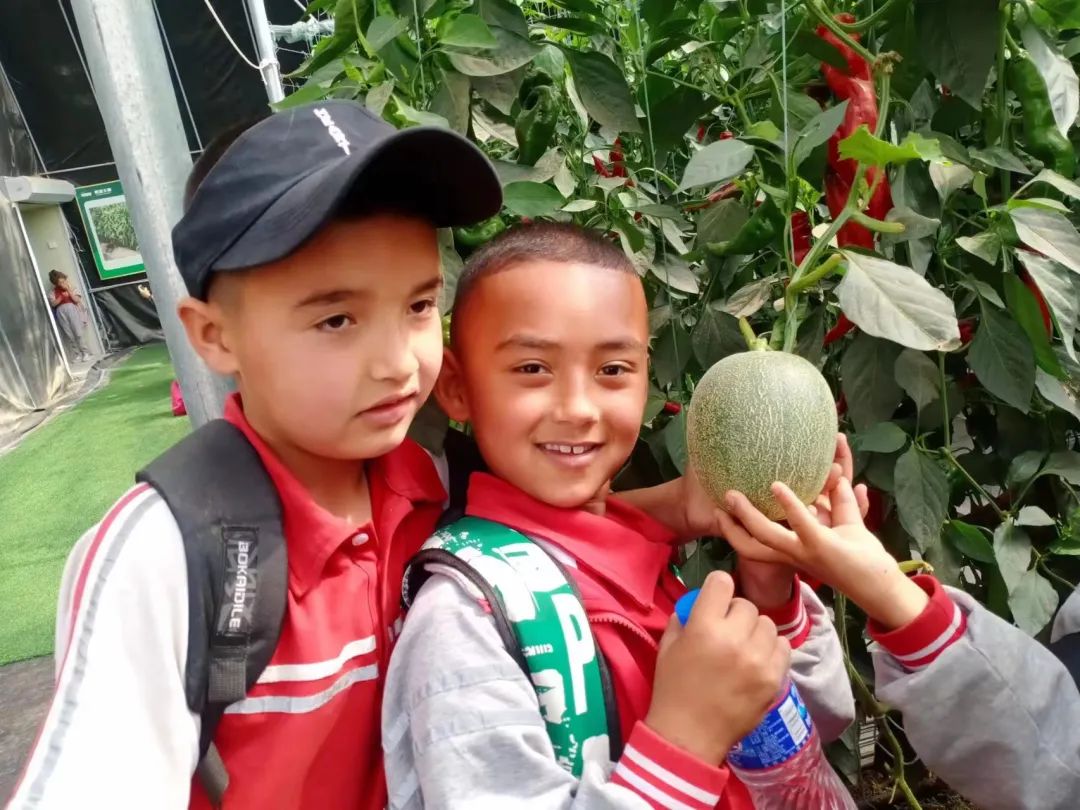 看!孩子们在大棚间穿梭,用眼观察着瓜果蔬菜,用手抚摸成熟的水果,品嗅瓜果的香甜。