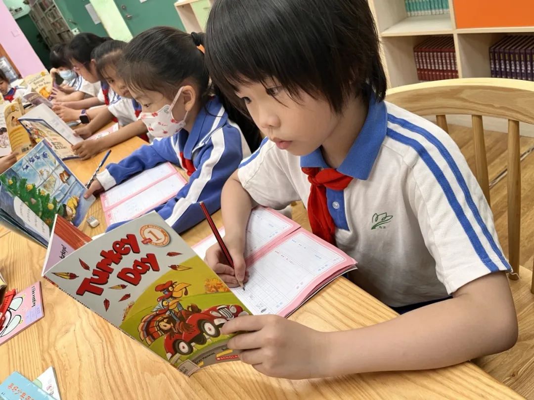 除了在课堂上带领孩子们读绘本,感受绘本的魅力,各年级老师分时段带孩子们进图书馆阅读绘本,引导孩子挑选和阅读绘本。内容丰富的绘本一下子吸引了孩子们的注意,瞧,同学们一个个聚精会神地读着,还有不少小书虫边读边记录呢!