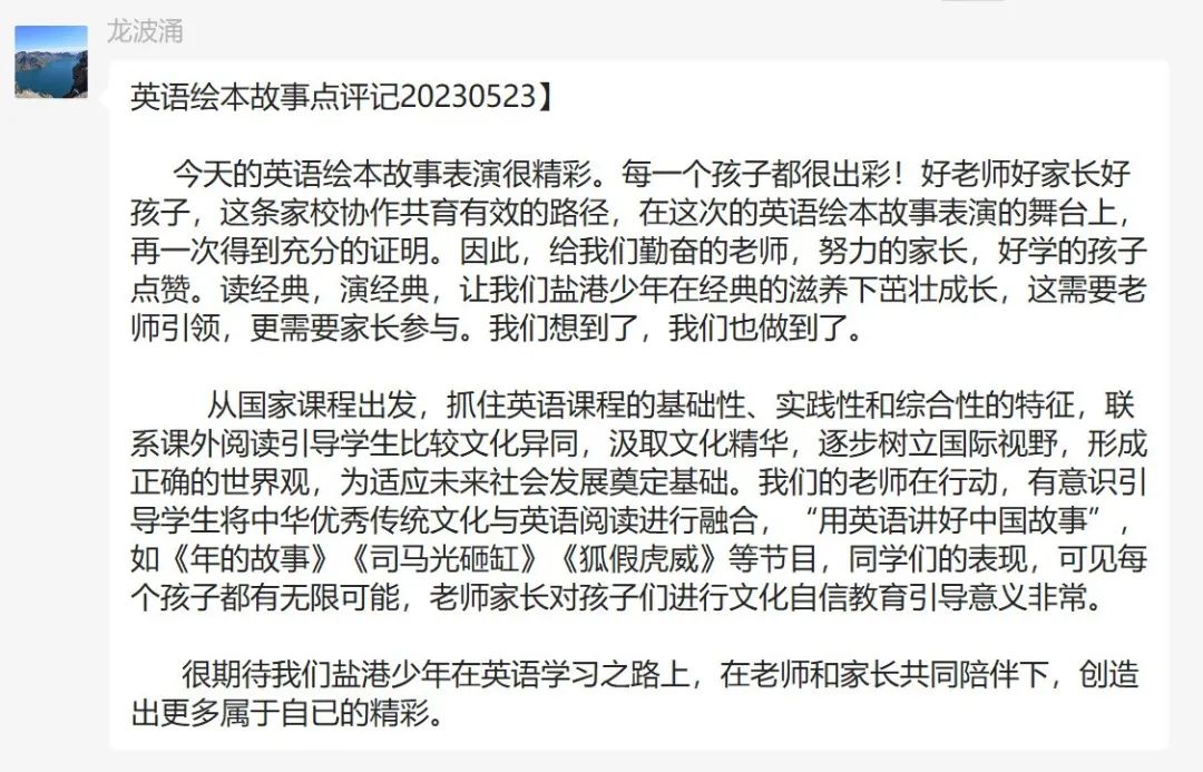 龙波涌校长就此次英语绘本故事表演比赛做总结,她首先肯定了全体参赛选手的努力,为所有参与其中的老师、家长和同学点赞,并希望同学们继续加油。总结中,龙波涌校长特别赞许三(1)班英文版《司马光砸缸》Sima Guang Breaks the Vat的表演。同学们将中华优秀传统文化融入英语进行趣味演绎,树立了中华文化自信。最后,龙波涌校长提出殷切希望:希望以后有更多的同学、家长参与到读书节中来,一起探究,一起创造,一起表演,一起传承民族文化的经典。