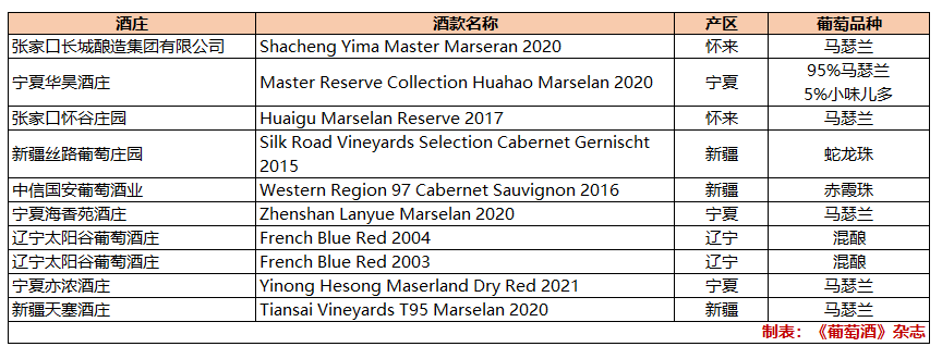 5月23日,CMB大赛的结果公布。在本届赛事上,中国葡萄酒共拿下108枚奖牌,其中包括10枚大金奖,49枚金奖和49枚银奖。令人感到兴奋的是,今年不仅大金奖的数量创下历年新高,获奖酒款所覆盖的产区以及酒庄,更有不少新的身影。在整份中国葡萄酒获奖名单中,从产区来看,今年参加CMB大赛的葡萄酒共来自中国10个产区,包括:北京、山东、宁夏、新疆、辽宁、甘肃、河北、福建、秦皇岛、陕西。其中,获得奖牌数量最多的产区依次是:宁夏、新疆和山东。从酒庄来看,国内知名的大酒庄几乎都有参赛,包括:张裕、长城、保乐力加、贺兰神、美贺、中信国安等,还有常见的精品酒庄,包括:新疆的天塞酒庄、丝路酒庄,山东的紫晶庄园、安诺酒庄,宁夏的贺兰晴雪、华昊酒庄、海香苑酒庄。一些酒庄的名字,此前我并没有见过,但是在今年的赛事中都拿到了不错的成绩,比如:辽宁的太阳谷,宁夏的亦浓、虎薇、望月石、容园美、卓德,新疆的千回西域,秦皇岛的秦皇岛金士,福建的蓝家渡,山东的仙岛等。这些大大小小的酒庄,用实力证明着中国葡萄酒的无限可能性。在葡萄品种方面,今年中国的获奖酒款共涵盖了11个葡萄品种,马瑟兰和赤霞珠的占比不相上下,但在大金奖的名单中,依然以马瑟兰为主的酒款占比最高。此外,还有梅洛、西拉、马尔贝克、品丽珠、小味儿多、小西拉等葡萄品种,更有5款用霞多丽白葡萄品种酿造的葡萄酒获奖,其中来自北京密云产区的霞多丽,还获得了金奖。
