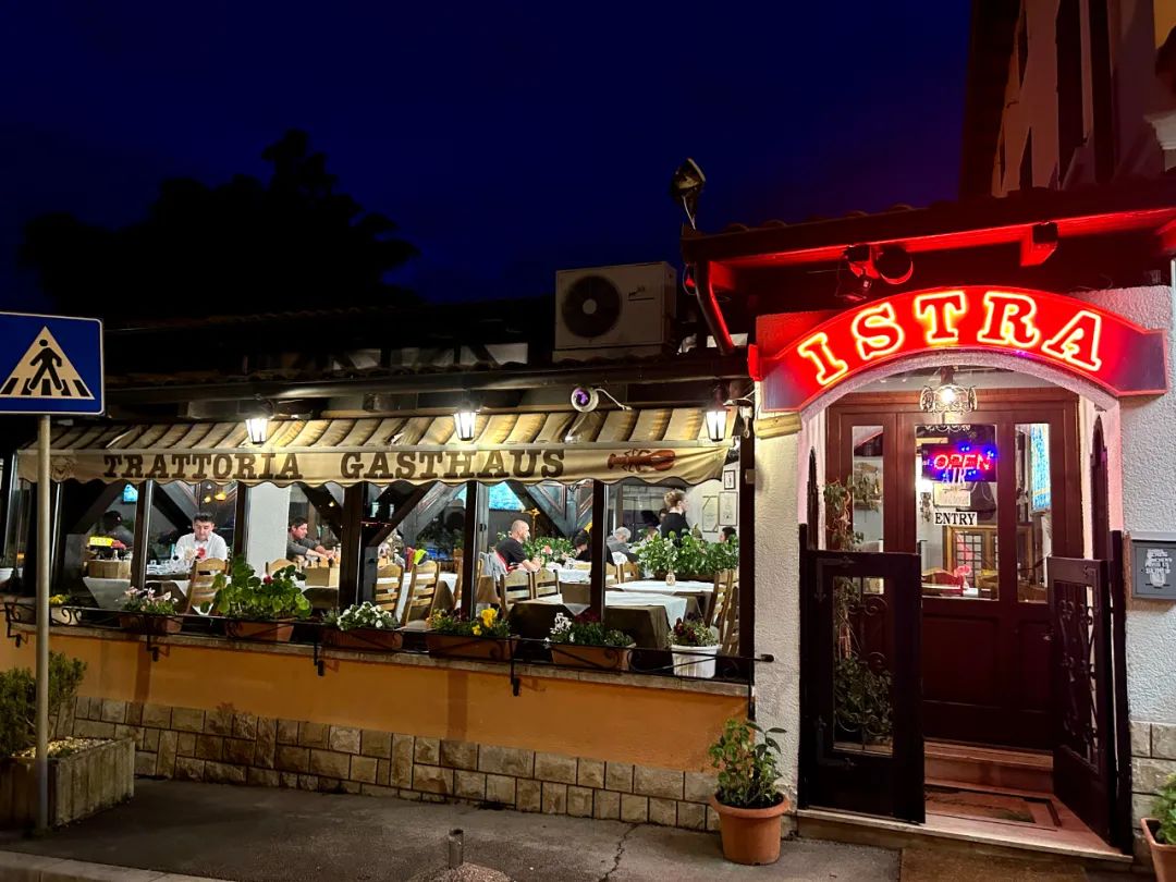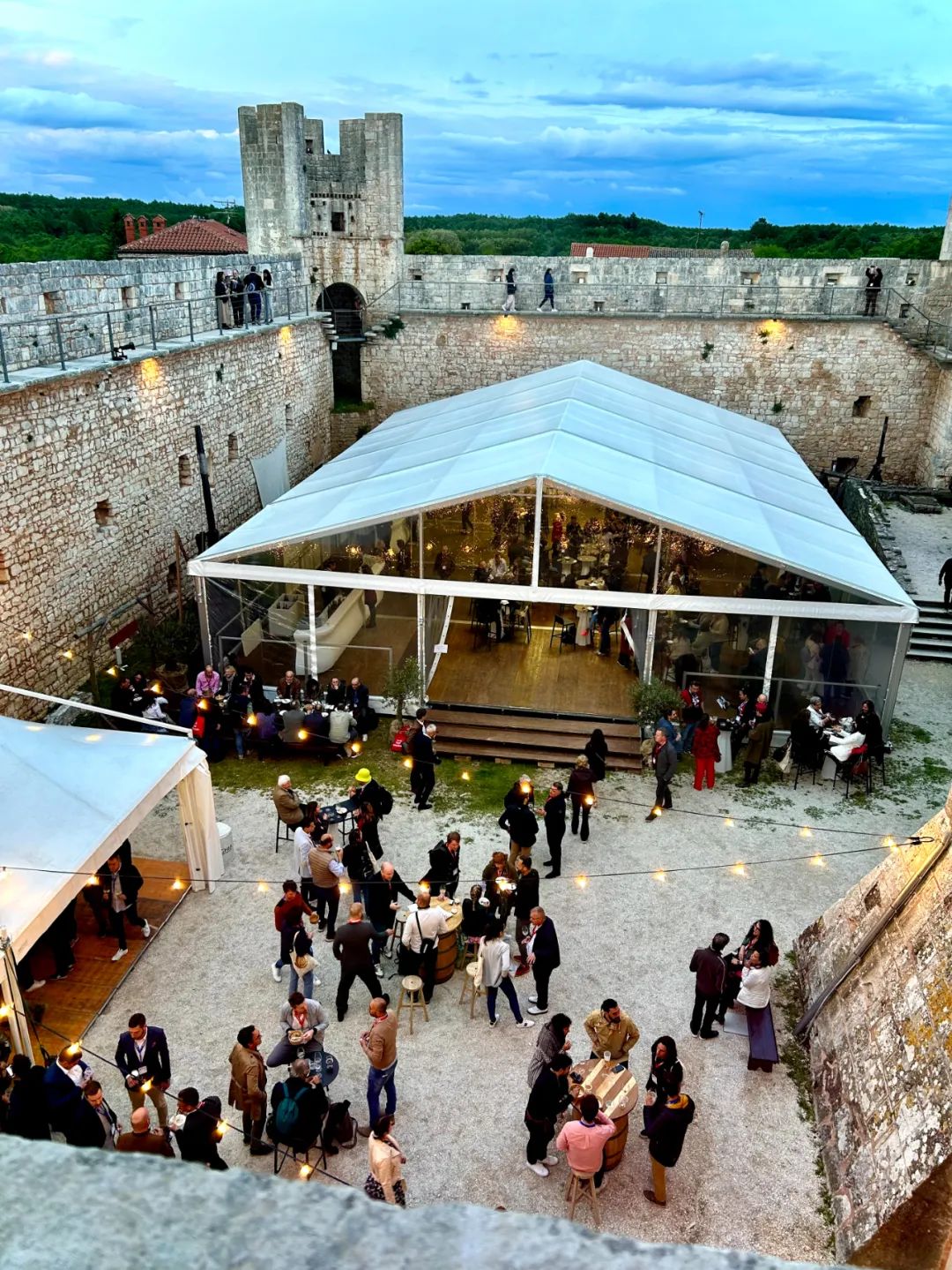 还记得某一天的晚上,我与同行的马老师走在克罗地亚的主城内。卖雪糕的爷爷穿着白色带花边的围裙,招呼我们进去买个雪糕,询问我们的中文名字,发音还真的挺标准;披萨店的小哥高举着托盘,热情地邀请我们进去享受晚餐;父亲带着孩子在海边钓鱼,年迈的夫妇手着牵手,带着狗狗遛弯。在巷子里兜兜转转,暖黄色的夜灯亮起,酒吧里逐渐坐满了人。街角餐厅挂着的Istra灯牌一闪一闪在发光,远看上去就像是一簇小小的烟花。在这里,我们度过了开心的夜晚。大赛结束的当天,主办方在当地的酒庄内举办了一场户外晚宴。葡萄园一望无际,在落日的余晖下,组成了一幅美不胜收的画面,大家都举着相机,记录下在克罗地亚的最后一晚。随着夜幕的降临,越来越多人举着酒杯来到泳池边,跟着音乐起舞,每一个人都很快乐。