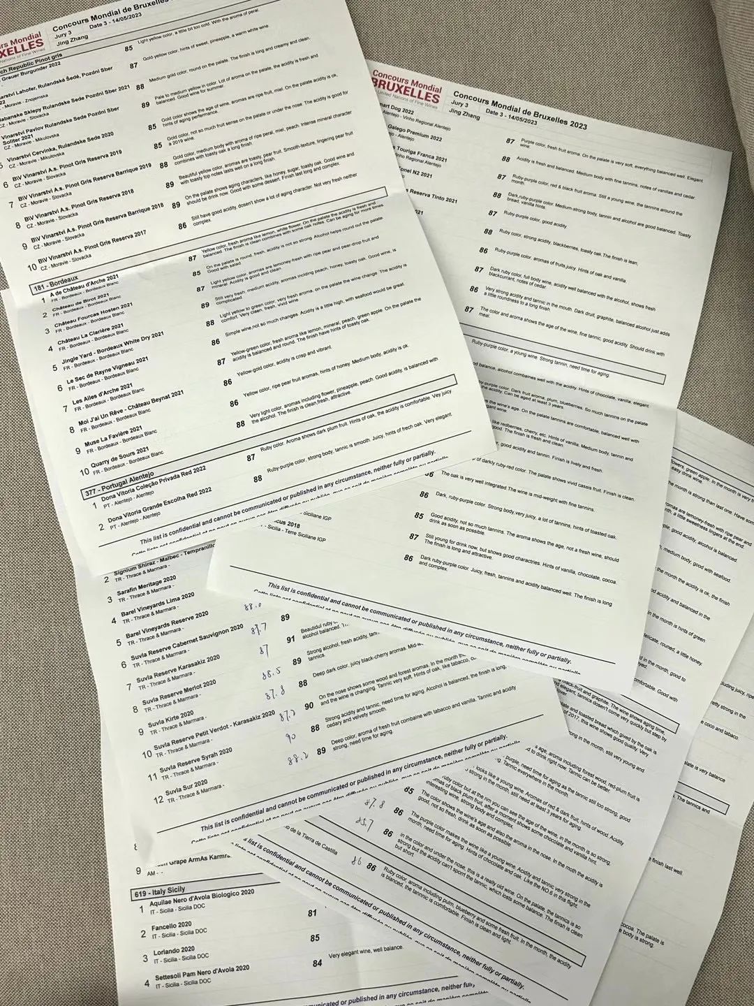 在每天的比赛结束后,评委都可以拿到自己当日的“成绩单”,上面会有当日品鉴酒款的详细信息,以及自己给出的分数和酒评。往往,在比赛结束后,评委们就会拿着这份成绩单彼此交流,探讨喝到的优秀酒款。
