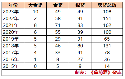 根据官网记载的数据,从2015年到2023年,在布鲁塞尔葡萄酒大赛这一国际舞台上,中国葡萄酒几乎可以用“突飞猛进”来形容。2015年时,中国仅获得了14枚奖牌,这一年并没有拿下大金奖。但仅仅用了3年时间,2018年时,中国葡萄酒获奖数量就已经过百并且达到131款,包含来自新疆、山东、宁夏、河北这四个产区的5枚大金奖。2021年,获得奖牌数量为162枚,达到新高,获得大金奖的8款葡萄酒中,不仅有红葡萄酒,还有来自辽宁产区,使用威代尔(Vidal Blanc)酿造的冰酒。