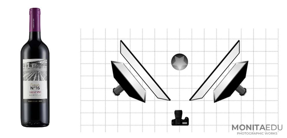 左右布光对称(俗称“夹光”),柔光箱前加硫酸纸进一步柔化光线,适合体现表面是磨砂材质表面的红酒瓶。