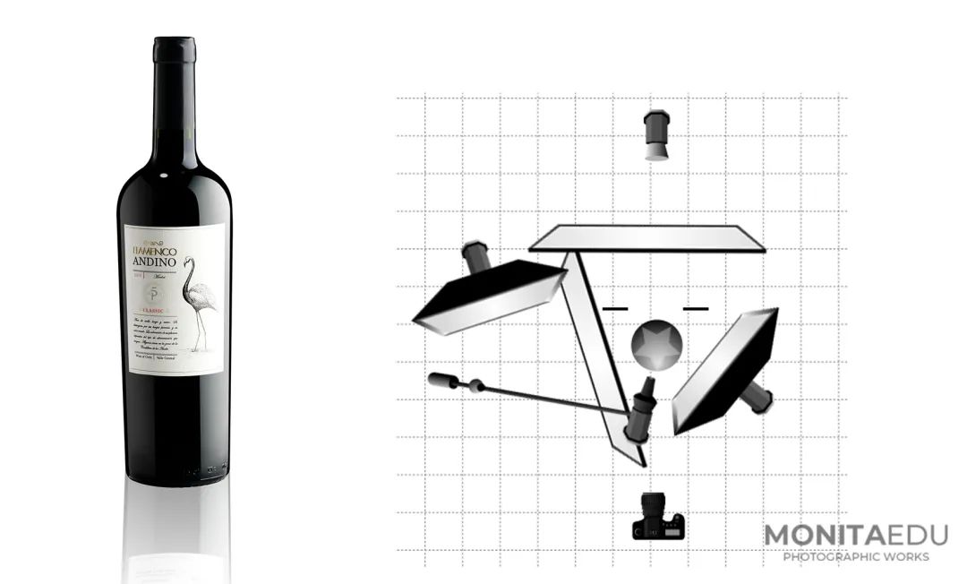 同样是左右布光对称,直接用柔光箱照明,能够表现表面材质是高反光质感的红酒瓶。