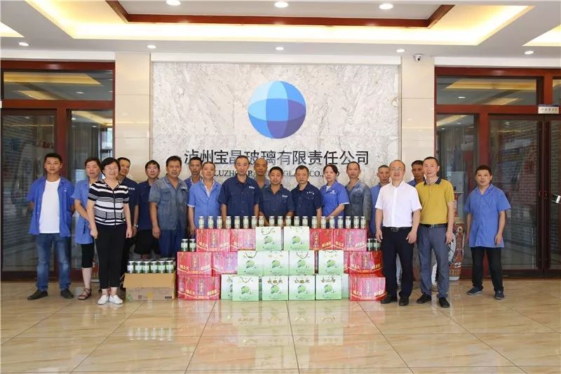 袁晓彬一行先后来到启航科技、宝晶玻璃等企业,为企业职工送上菊花茶、金银花、王老吉等清热解暑饮品。