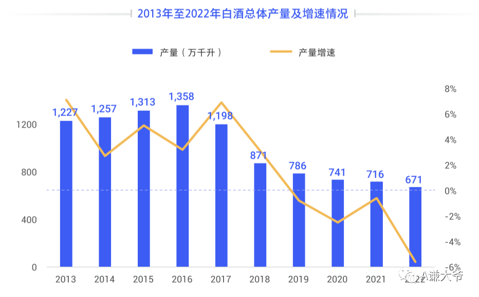 自2017年以来,白酒年总产量的增速便开始逐年下降。2019年起,产量出现负增长,2022年白酒产量 671.24 万千升,同比下降 5.58%。其中产量头部的6个省份产量为495.94万千升,占行业比重为73.88%。