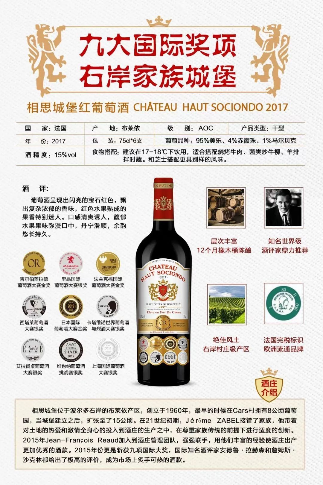 层次丰富,12个月橡木桶陈酿。