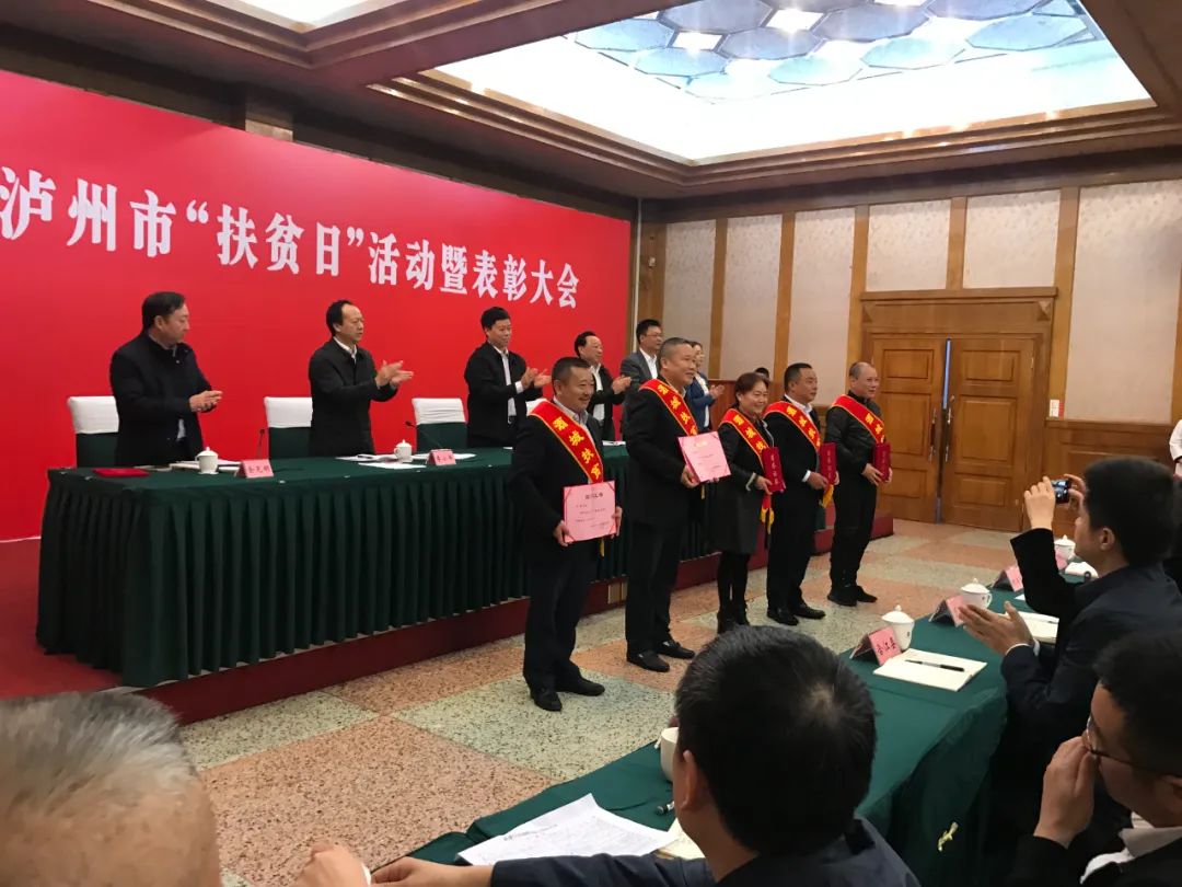 ▲集团董事长沈鸿林(前排左二)获得“酒城扶贫好人”荣誉称号