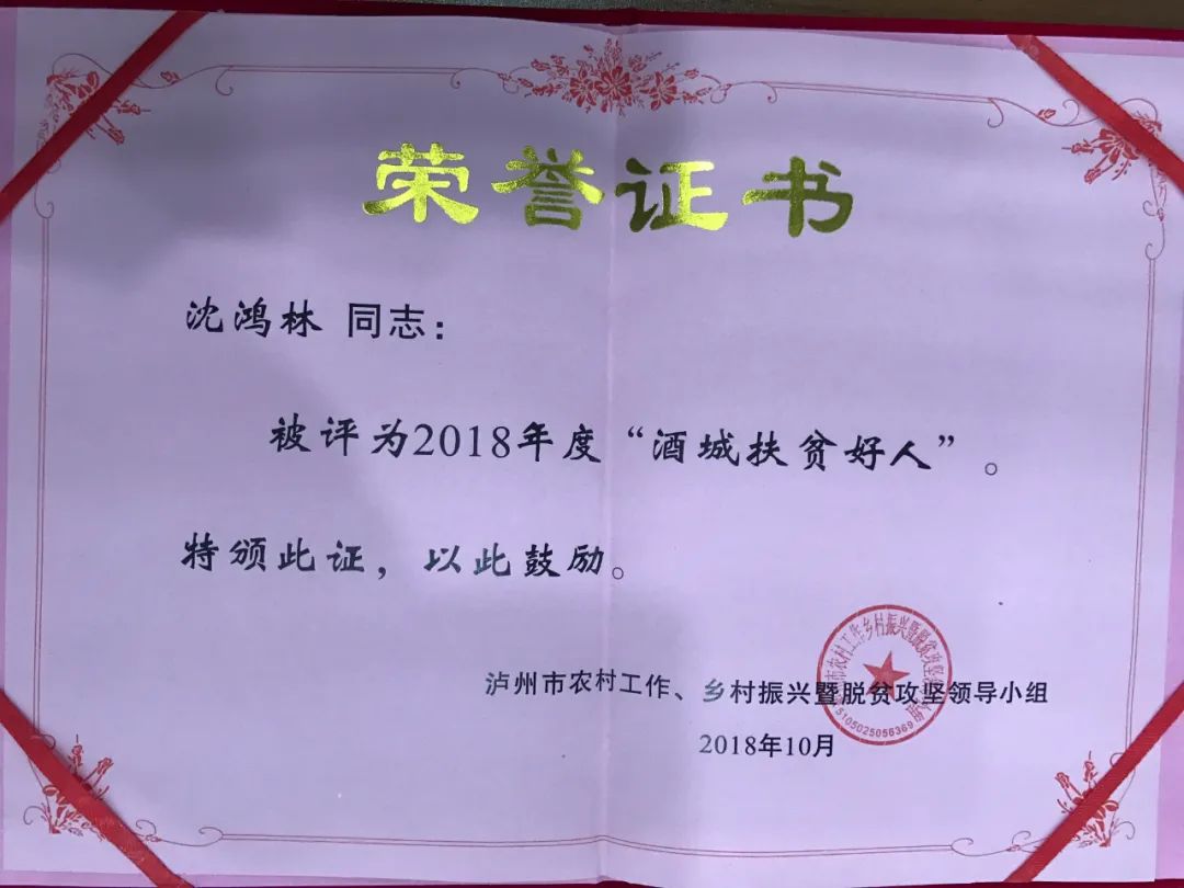 2017年,中国沈酒集团就已获得过“‘万企帮万村’省级示范单位”与“泸州市‘百企联百村’先进单位”两项荣誉;集团董事长沈鸿林、集团总经理沈连亦先后获得了“酒城扶贫好人”称号;