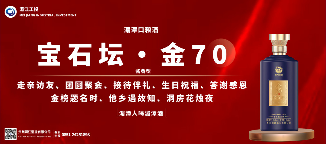 2023年3月,借湄窖建厂70周年庆典之际,在县委、县政府的领导下,湄江工业投资集团与贵州湄窖酒业公司达成战略合作,隆重推出“宝石坛·金70”,它集合了优质酱酒酿造资源,由大型酱香酿酒企业精工酿造,万吨陈年老酱库存备用优质酱酒酿造资源,数家大型酱香酿酒企业精工酿造,精选6年基酒加上15年以上陈年老酒,数十位知名专家和资深酿酒大师精心设计,倾力打造。宝石坛·金70酱香型白酒,走亲访友带它、团圆聚会喝它、接待伴礼送它、感恩祝福用它。湄潭口粮酒,酱香金70。义泉八景即湄潭老八景,湄江古称义泉,历史悠久,文化厚重,故事寻味,围绕义泉在城域周边有“玉山凤起、朝阳古洞、释慈晓钟、后溪鱼影、泽溪兰吹、水源洞天、虚阁暮烟、寒潭映月”八处有名的景点。以义泉八景为主题为商标,将每一款酒以老八景的其中一景进行命名作为系列品名。就有了义泉八景的酒名来源,我们的产品主要以酱香为主,主分四大系列,八款产品。分别为投资收藏产品、文创消费产品、主题定制产品、大众口粮产品。贵州两江酒业有限公司