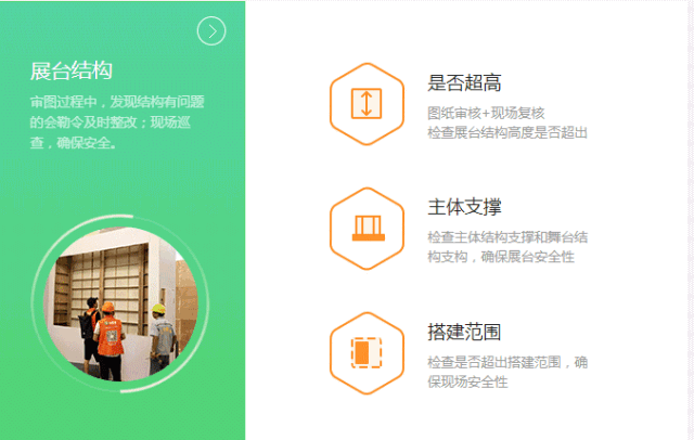 从前期的图纸审核,到展台的搭建以及撤展,每一步都严格按照标准才能呈现更好地参展效果。而会展城从始至终严格按照第三方中立角度出发,实行标准衡量与监理机制,正规合理排除搭建隐患。