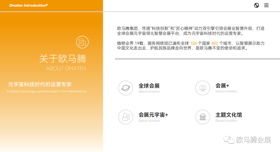 说到欧马腾会展,大家所熟知的业务领域,就是做会展策划、运营、搭建服务,再涉及到更深入的领域和荣誉,那就是还连续服务了五届的中国国际进口博览会,还可以做活动策划、厅馆策划。除此之外,在会展元宇宙的时代,持续探索线上会展领域率先提出线上“云展馆”以及全息智慧化的展陈方式并获得多项知识产权。